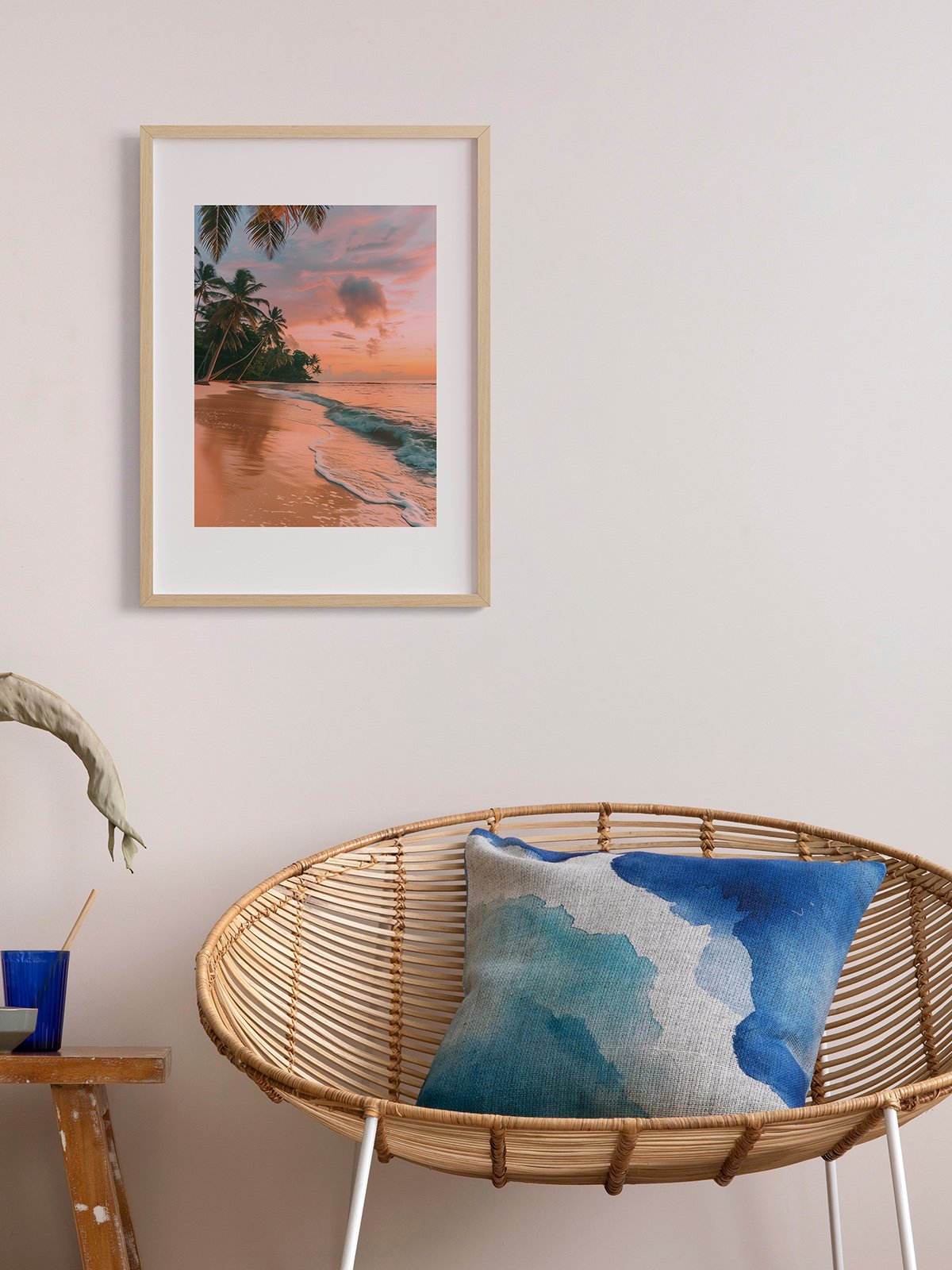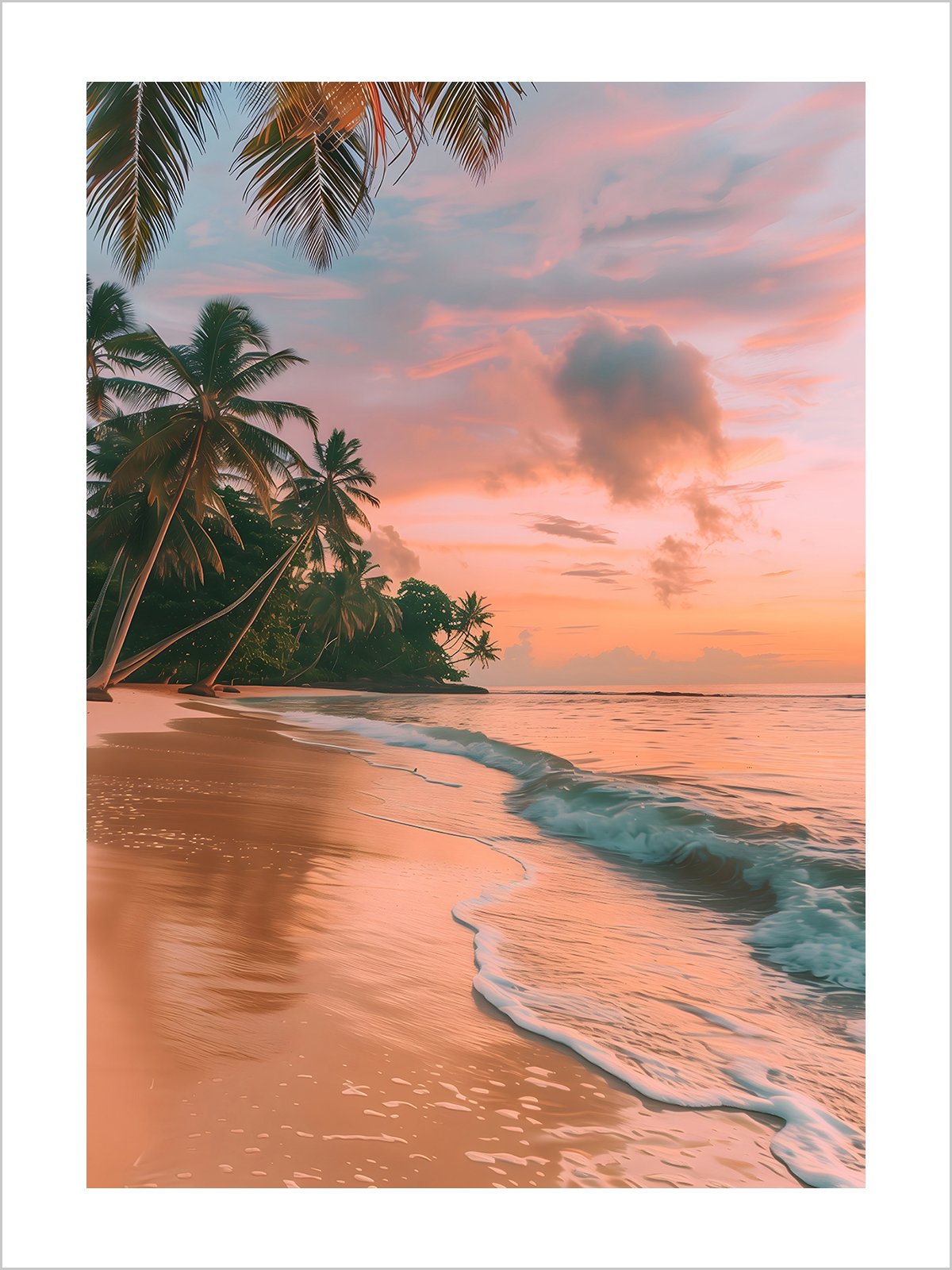 This painting depicts a tropical beach with palm trees swaying in the soft glow of the sunset. The waves gently lap the shore, and the sky is painted in beautiful shades of pink and orange. The entire scene evokes a sense of tranquility and relaxation, making one feel as if they are in a paradise.