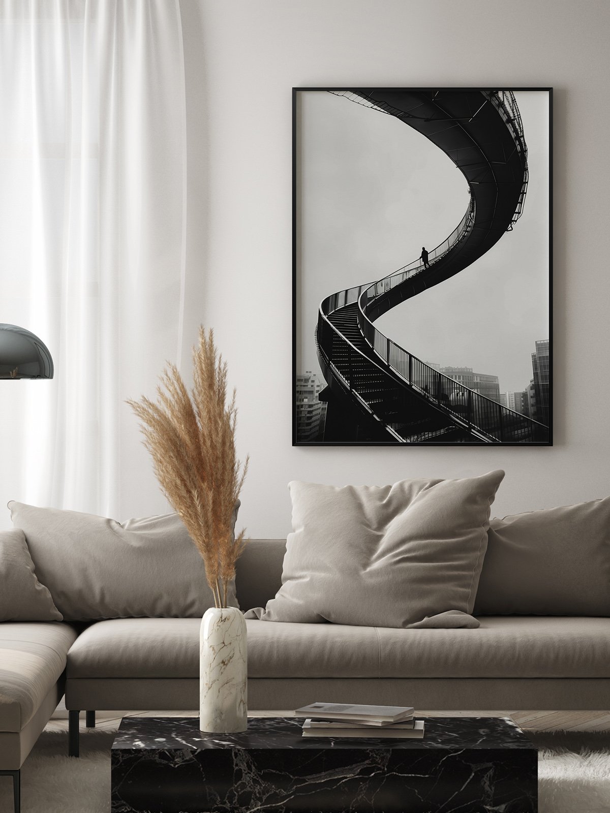This black-and-white photograph captures a pedestrian walking on a winding modern skybridge. The curvilinear design of the bridge stands out against the empty background, creating a visual effect of endless extension. The figure of the walker appears solitary yet resolute, symbolizing an unending journey and exploration in modern urban life. The entire image is simple yet powerful, conveying a profound philosophical reflection and visual impact.