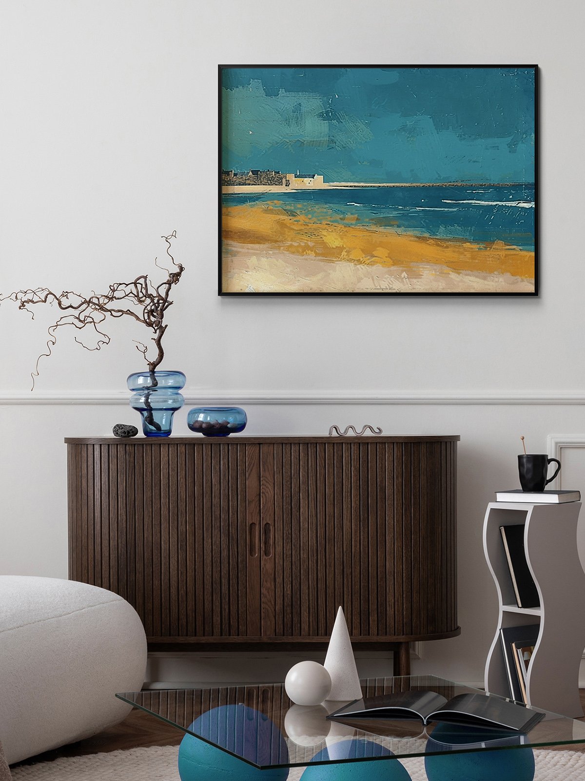 This artwork depicts a serene beach scene where the golden sands sharply contrast with the deep blue sea. The simple structures in the background and the distant horizon add depth to the image. The bold use of color and straightforward brushstrokes evoke a sense of summer sunshine and leisure, almost allowing one to hear the waves lapping against the shore, offering a feeling of tranquility and relaxation.