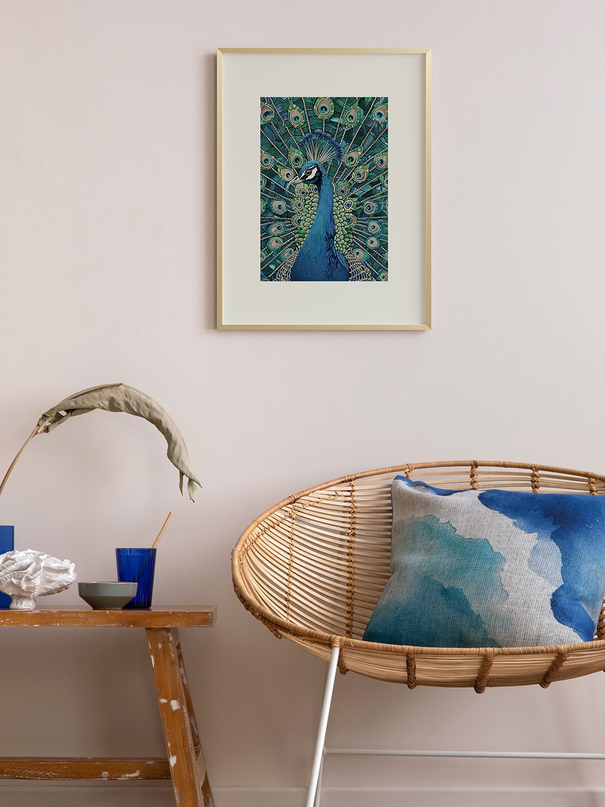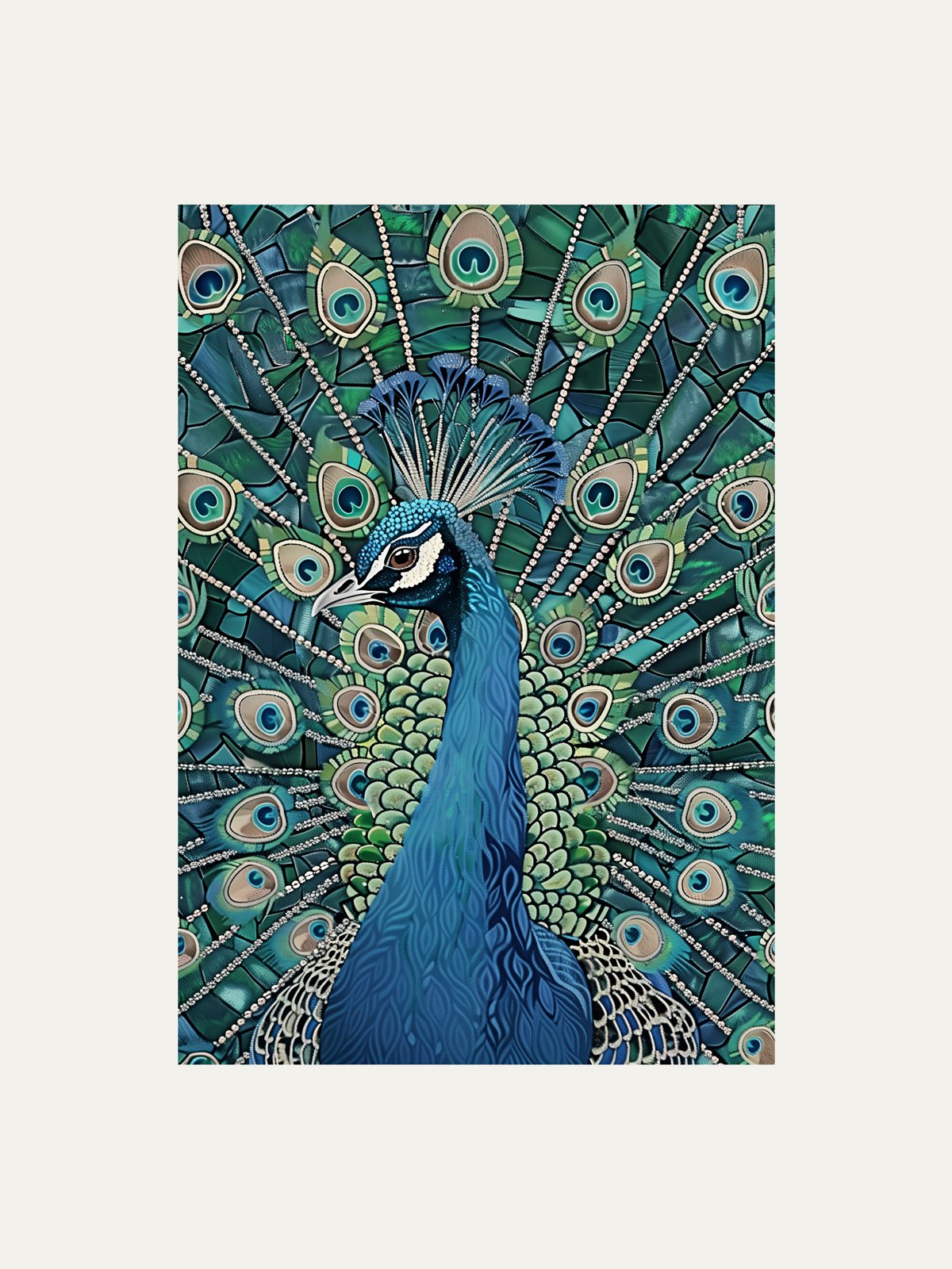 This painting showcases a peacock with its magnificent feathers fully displayed, vibrant in color and intricate in design, offering a visual feast and a sense of joy. The peacock’s graceful stance and splendid plumed crown symbolize the beauty and mystery of the natural world.