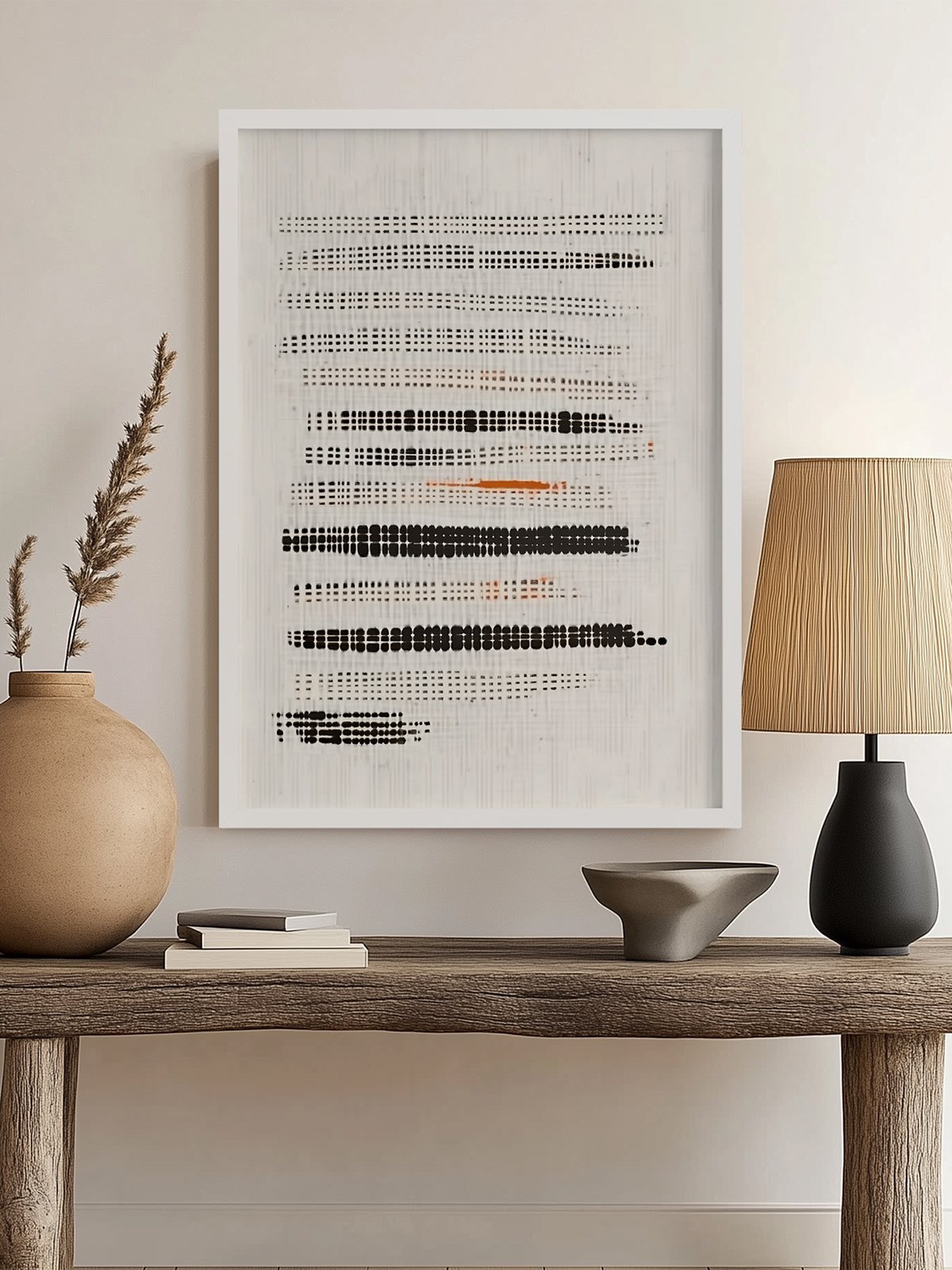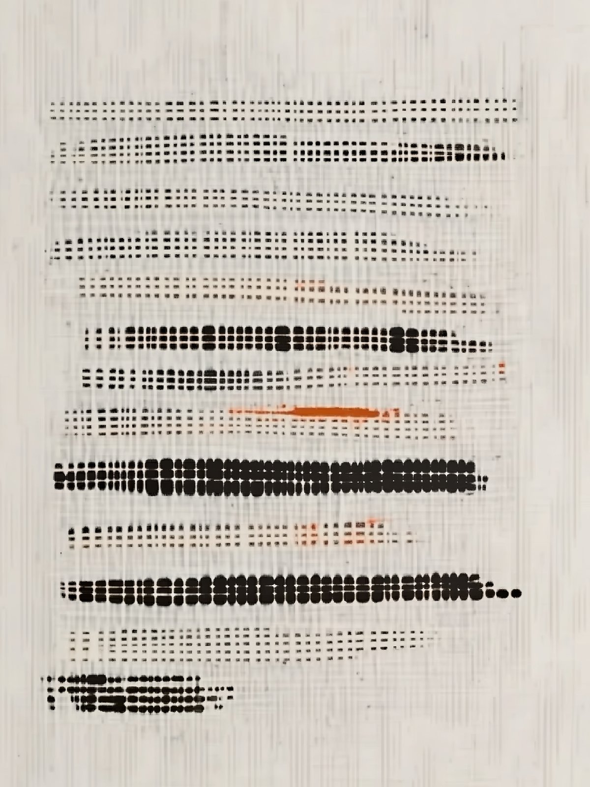 | Like verses woven from digital rain, the black dots and orange streaks dance in harmony—blurring clarity and chaos, whispering a hidden tale with warmth and rhythm. |