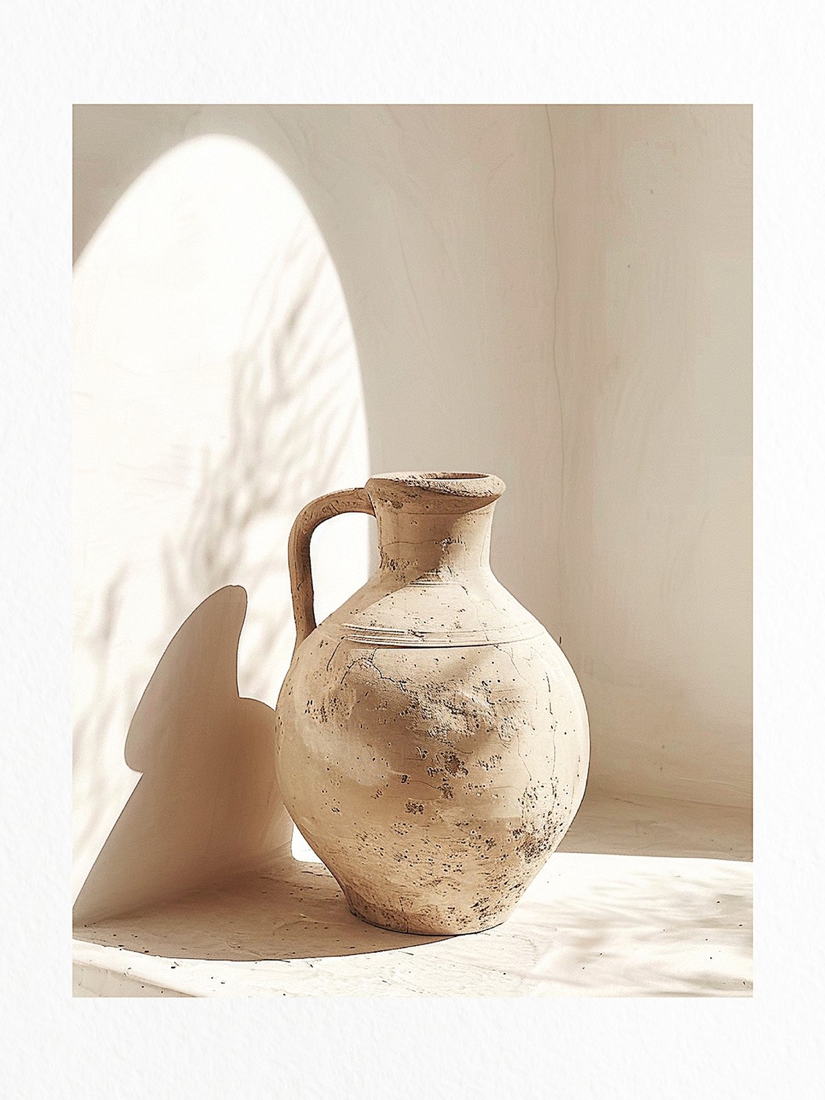 A rustic ceramic teapot with a round body and slender neck, showcasing a clever design. The play of light and shadow adds warmth and tranquility to the scene, as if telling an ancient story. The entire piece is simple yet artistically rich, conveying the rustic charm of ceramics and the profound weight of history.