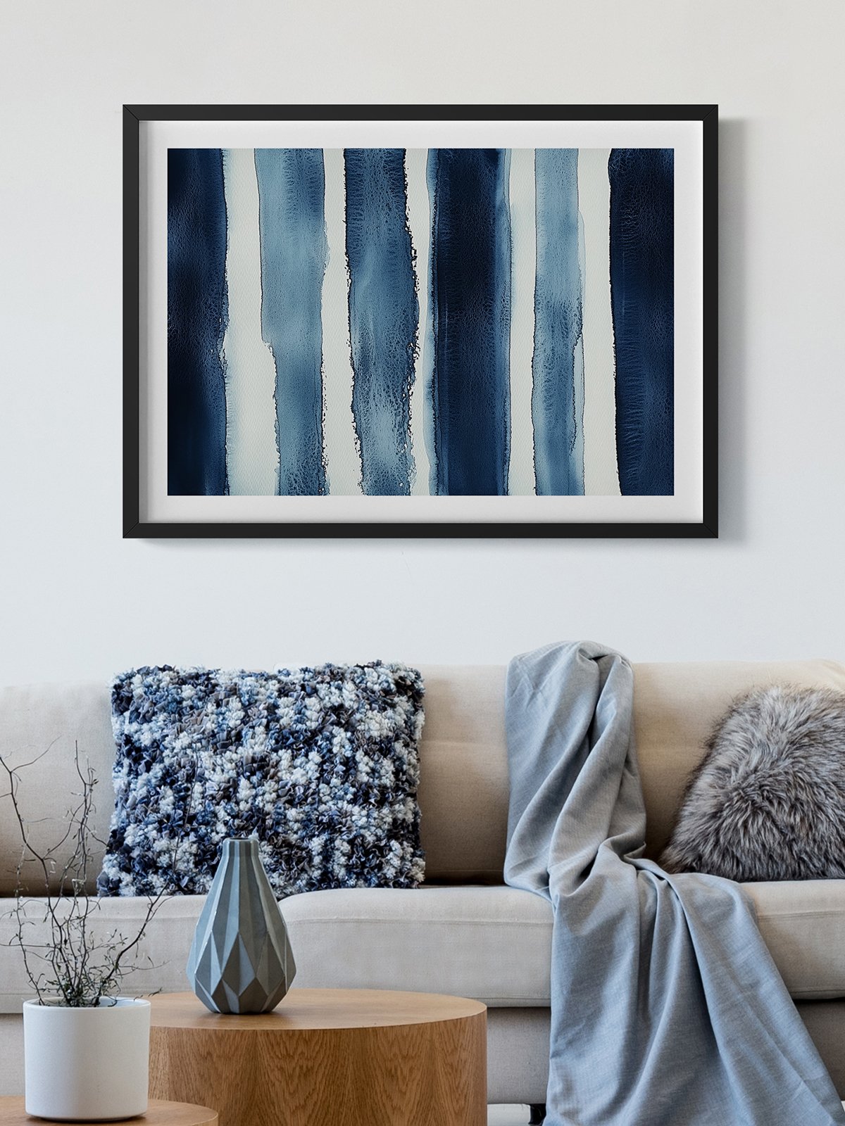 Vertical streaks of varying blue shades flow like the rhythm of waves across paper—minimal yet powerful. The composition evokes a sense of quiet order and fluid motion, as if listening to a soft blue symphony.