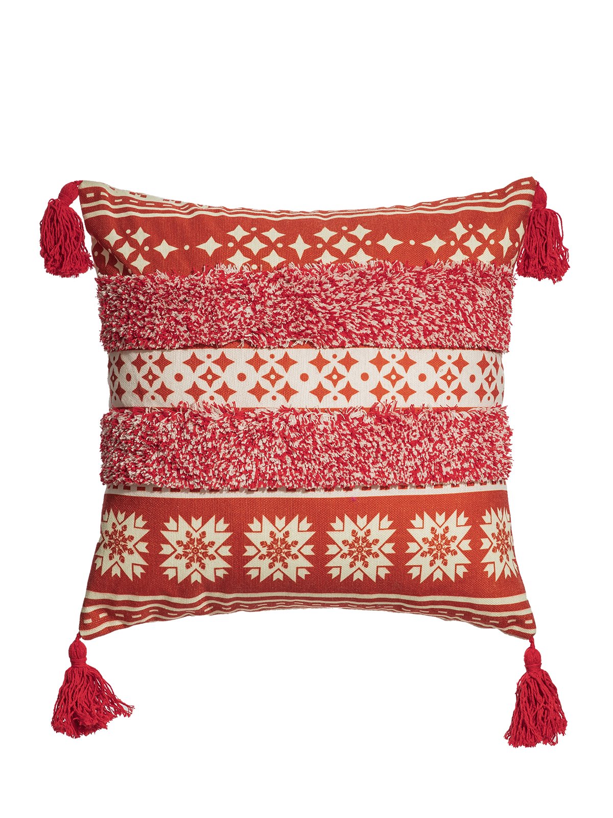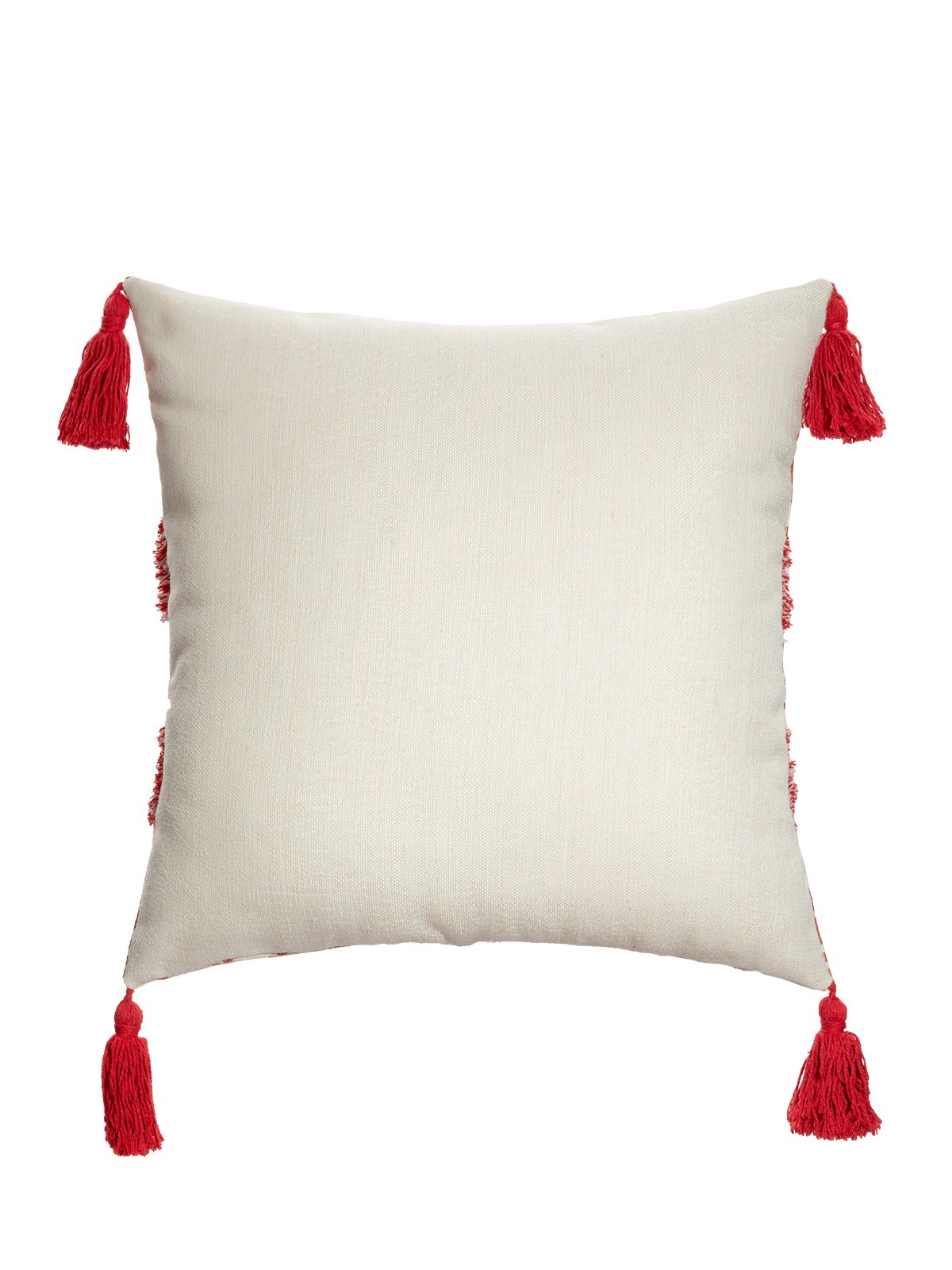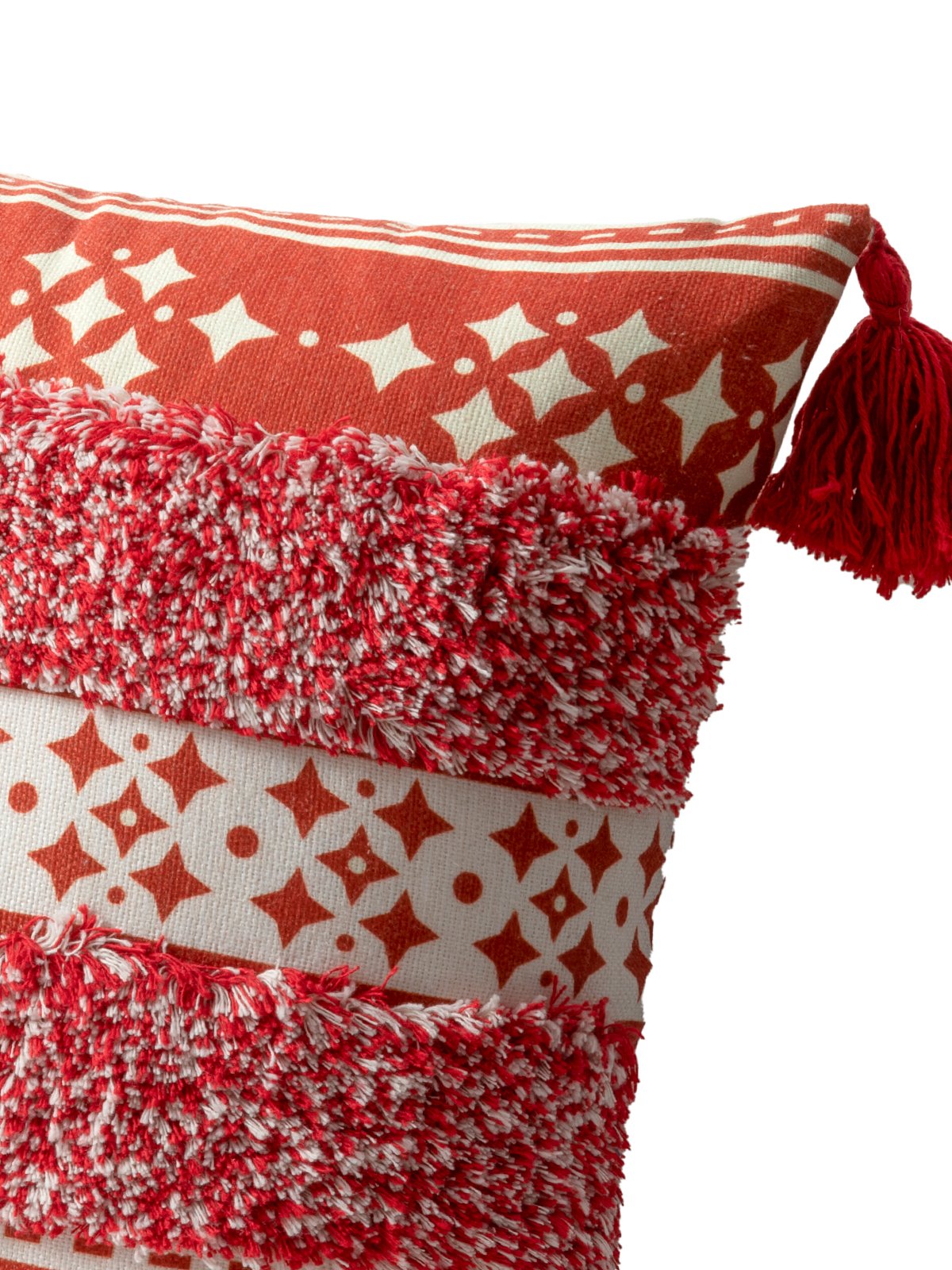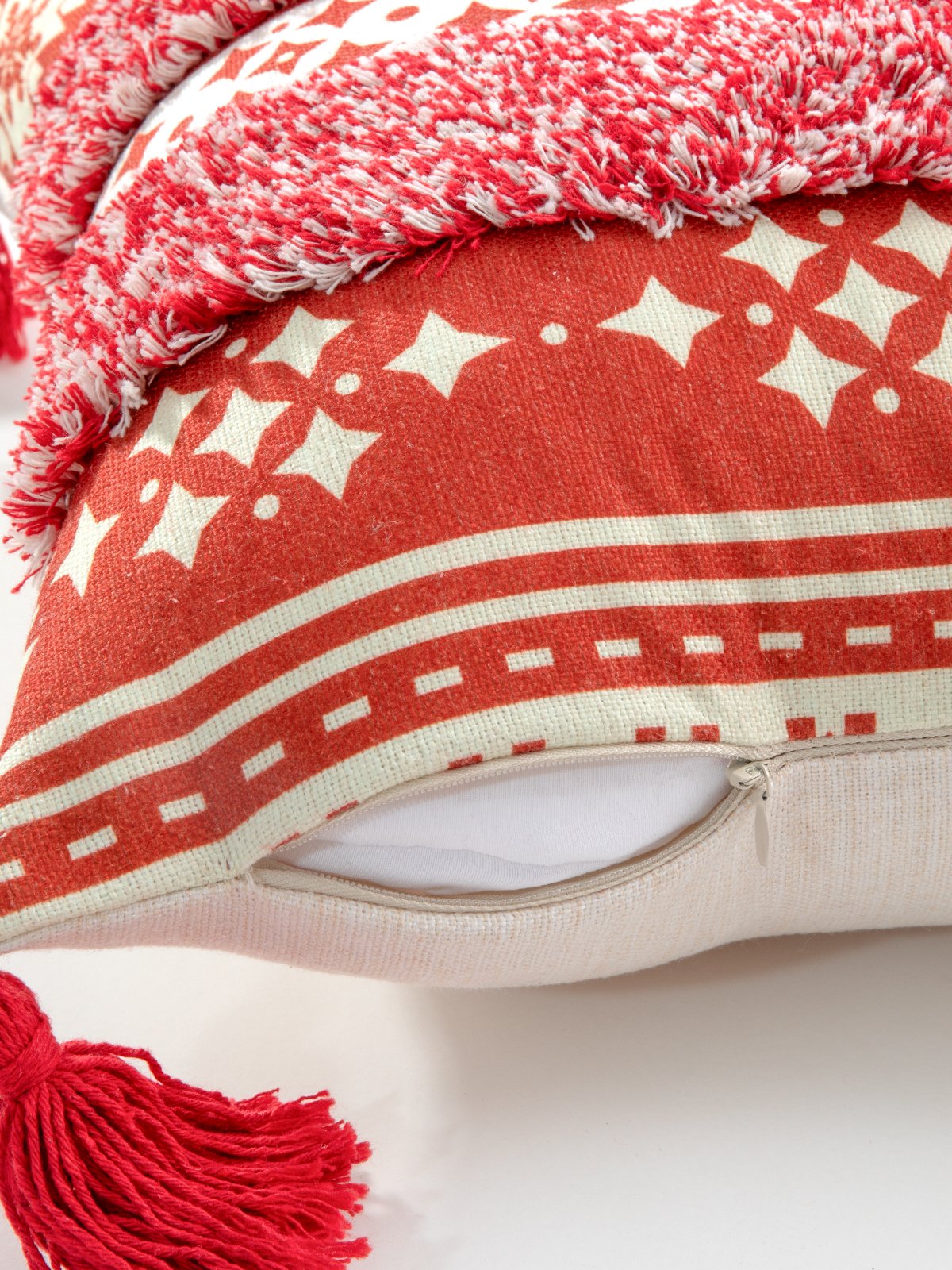 The strong bohemian style brings a free and romantic atmosphere to the home environment. The red and white stripes are embroidered with creative hoops to create a more three-dimensional concave and convex look. The tufting process neutralizes the slightly rough feel of the canvas fabric. Featuring lively tassels on the sides. Concealed zipper, easy to remove and wash.