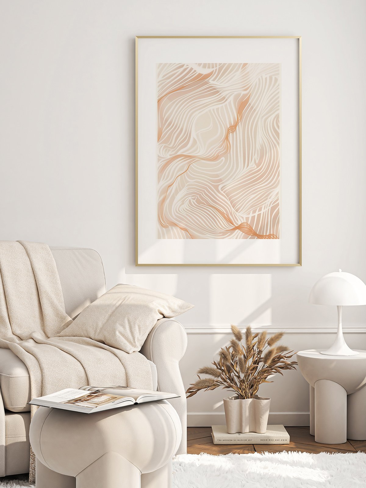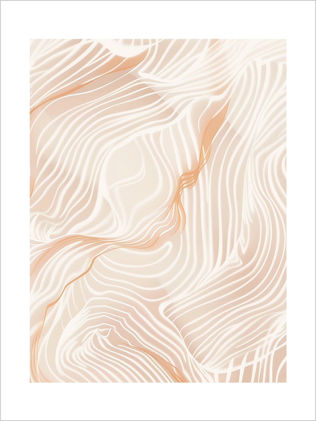 This abstract artwork features an interplay of soft lines and colors, flowing like water across the canvas. The warm hues of orange and off-white blend together, creating natural textures and curves that evoke a sense of movement and grace. The simplicity and harmony of the composition impart a feeling of tranquility and fluid beauty, as if immersed in the embrace of nature, experiencing the rhythm and harmony of life.