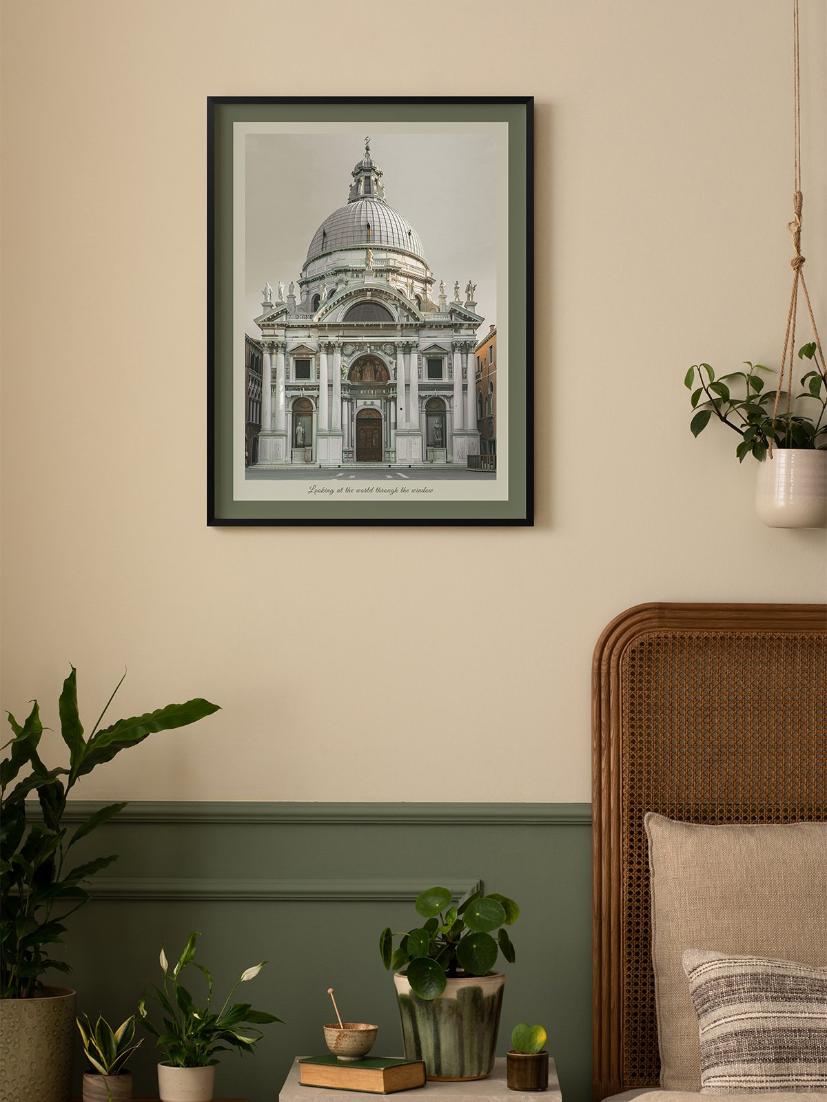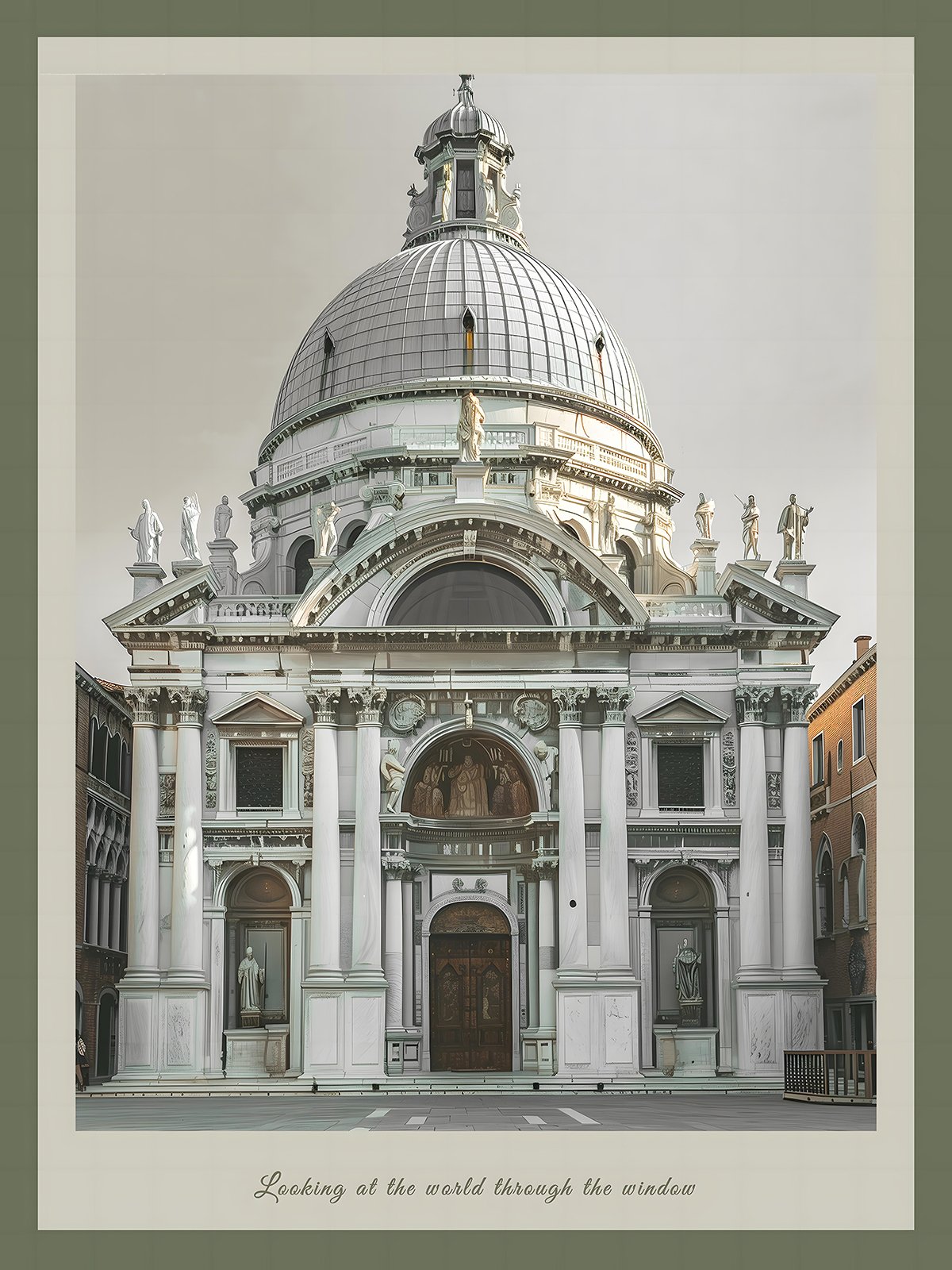 This image showcases a magnificent Baroque-style building adorned with intricate carvings and columns on its facade. The dome at the top stands out against the grayish-white sky, exuding a sense of purity. The window above the grand entrance seems like a portal to another world, imparting a solemn and sacred feeling. The text at the bottom, «Looking at the world through the window,» enhances this sense of traversing between reality and dreams.