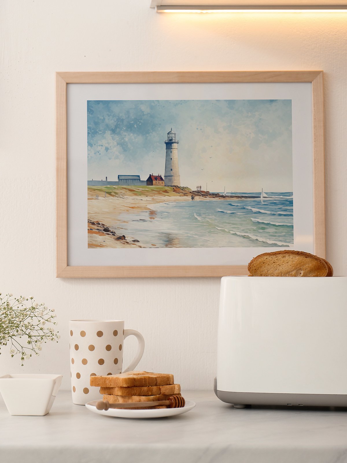 On a tranquil seaside, a lighthouse stands tall at the end of the sandy beach, guiding passing ships. The bright blue sky blends with the warm sunlight, and gentle waves lap the shore. The small house beside the lighthouse and the distant sailboats add to the serenity and beauty, creating a picturesque coastal scene that evokes a sense of calm and the refreshing sea breeze.