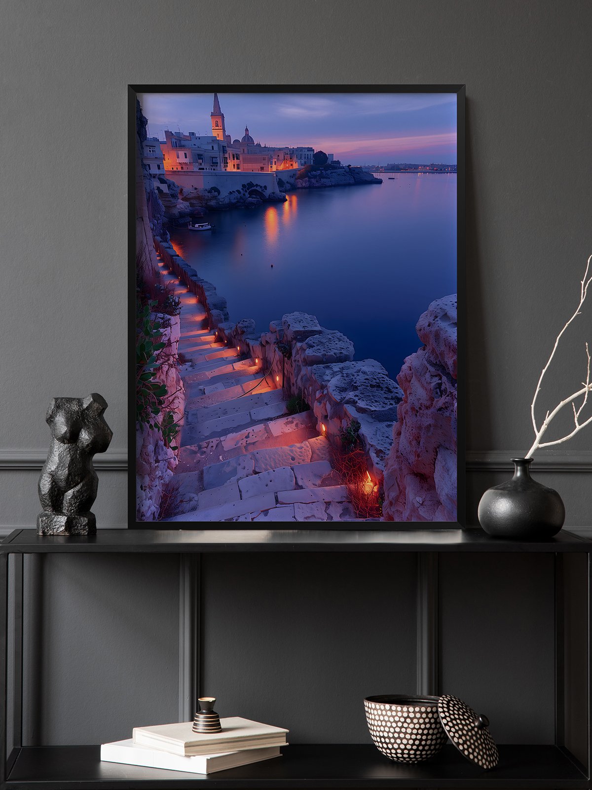 The picture shows a charming seaside city at night. The illuminated steps lead to the quiet bay, where the pale blue to purple sky reflects the evening, giving you a panoramic view of the seaside scenery at quiet night.