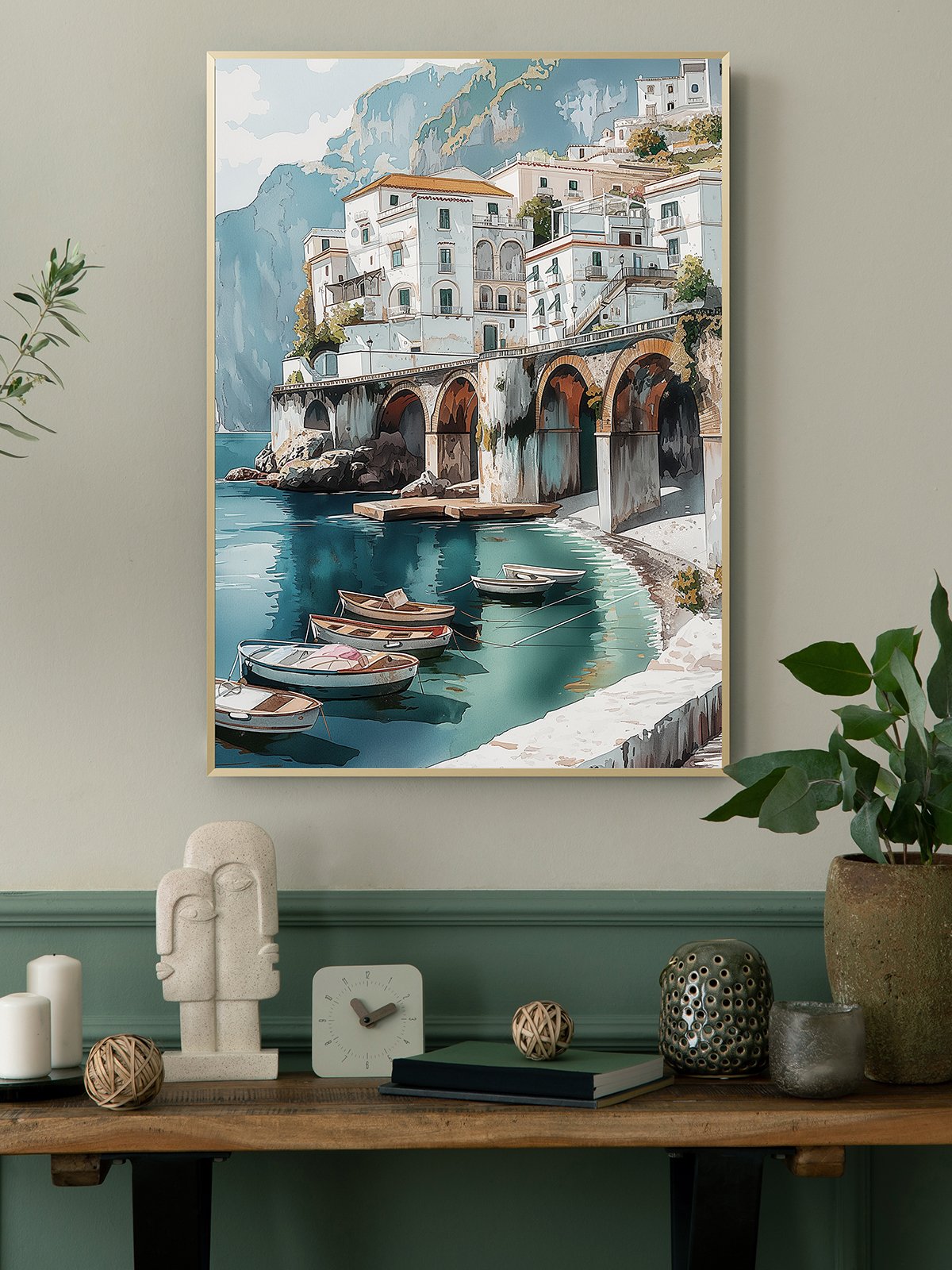 A beautiful town nestled by mountains and water. Houses with white walls and green windows are arranged in a picturesque manner, with arched bridges connecting over crystal-clear seawater below. Several small boats gently float on the sea’s surface, creating a tranquil and leisurely atmosphere. The contrast between distant mountains and nearby buildings is refreshing and soothing to the soul.