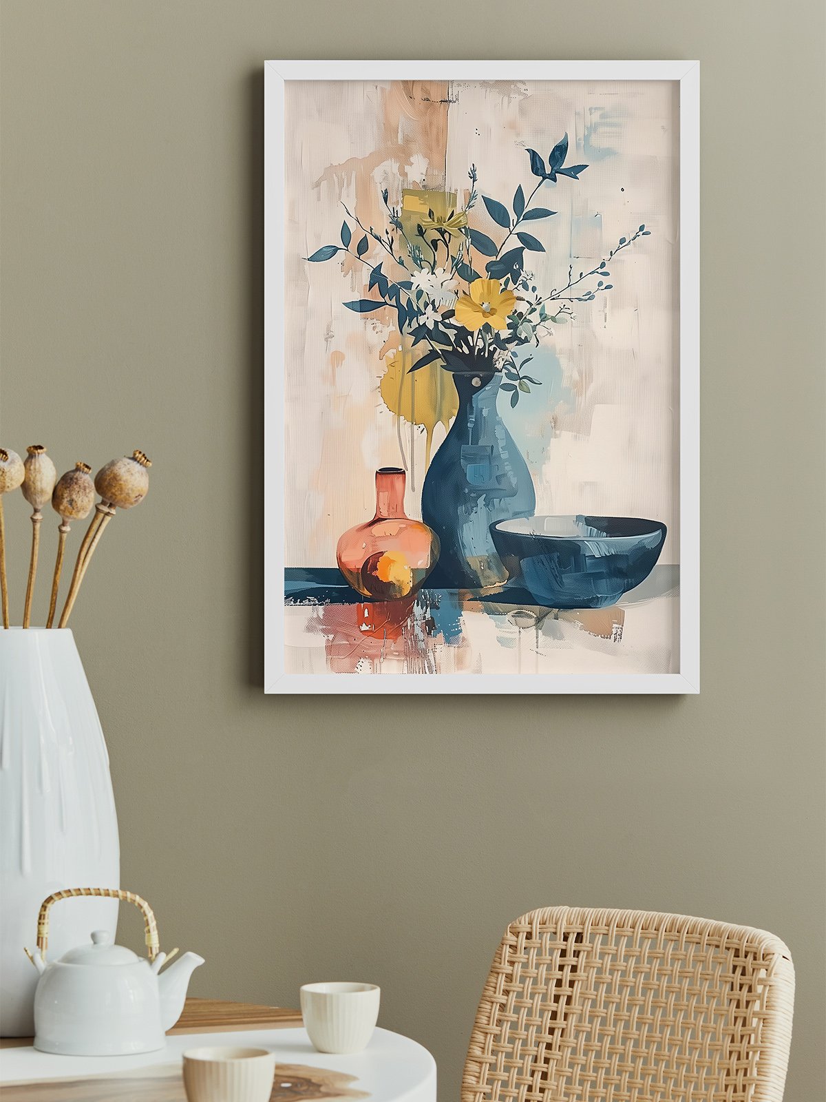 This painting depicts a still life arrangement with a blue vase holding yellow flowers and green leaves, a red glass bottle, and a blue bowl. The background features soft pink and beige abstract color blocks, creating a serene and elegant atmosphere. The harmonious colors of the overall picture provide a sense of calm and relaxation, as if finding a moment of peace in a busy life.