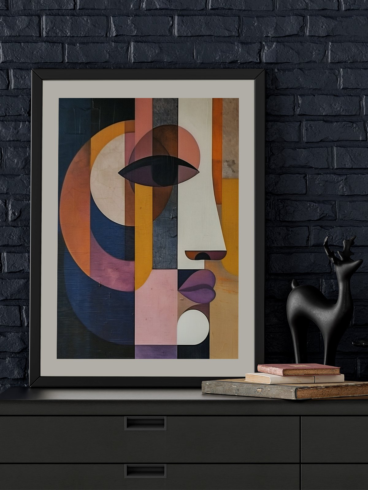 This abstract painting portrays a stylized human face, rendered through a geometric interplay of shapes and colors. The composition uses bold lines and distinct blocks of color to form the features of the face, blending elements of cubism and abstraction. The palette is a mix of muted tones such as deep blues, warm ochres, soft pinks, and rich purples, creating a sense of depth and introspection. The overlapping and intersecting shapes suggest layers of thought and emotion, while the precise, clean lines provide a sense of calm and order. The overall effect is one of quiet contemplation, inviting viewers to explore the complexities beneath the surface.