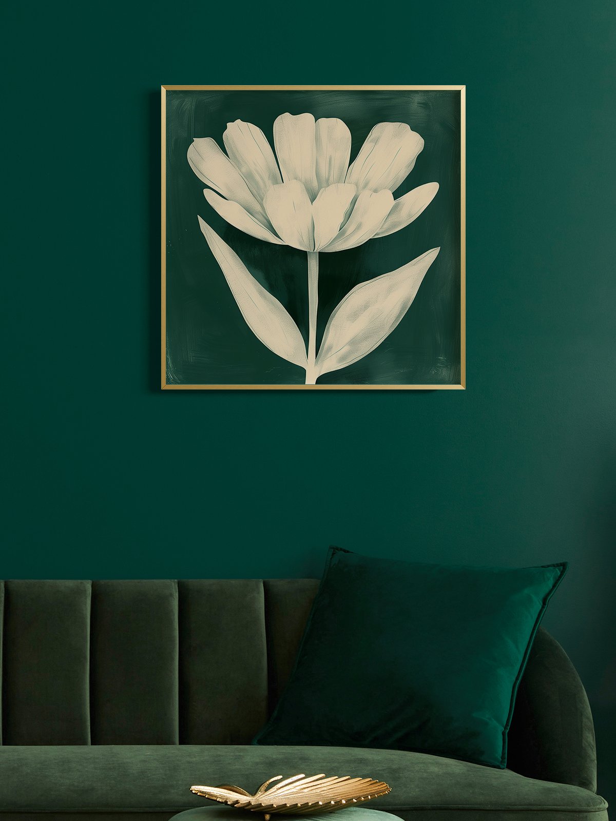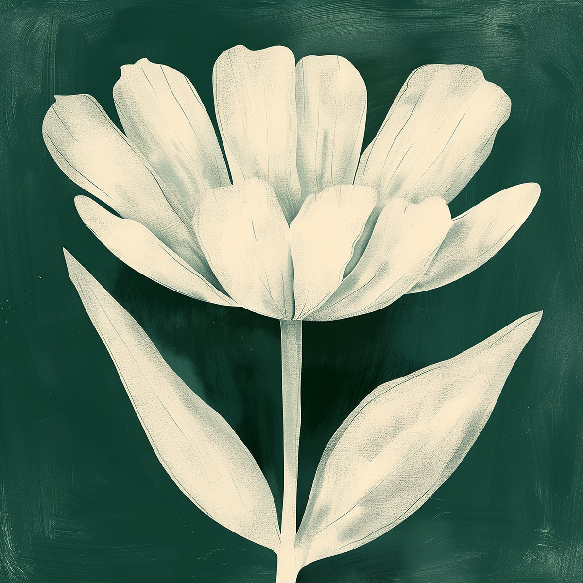 «Silent Bloom» portrays an elegant white flower against a deep green background. Delicate strokes highlight the texture of the petals and leaves, as if quietly blooming in the tranquil night. The simple color palette and soft lines create a serene and harmonious atmosphere, evoking the purity and beauty of nature.