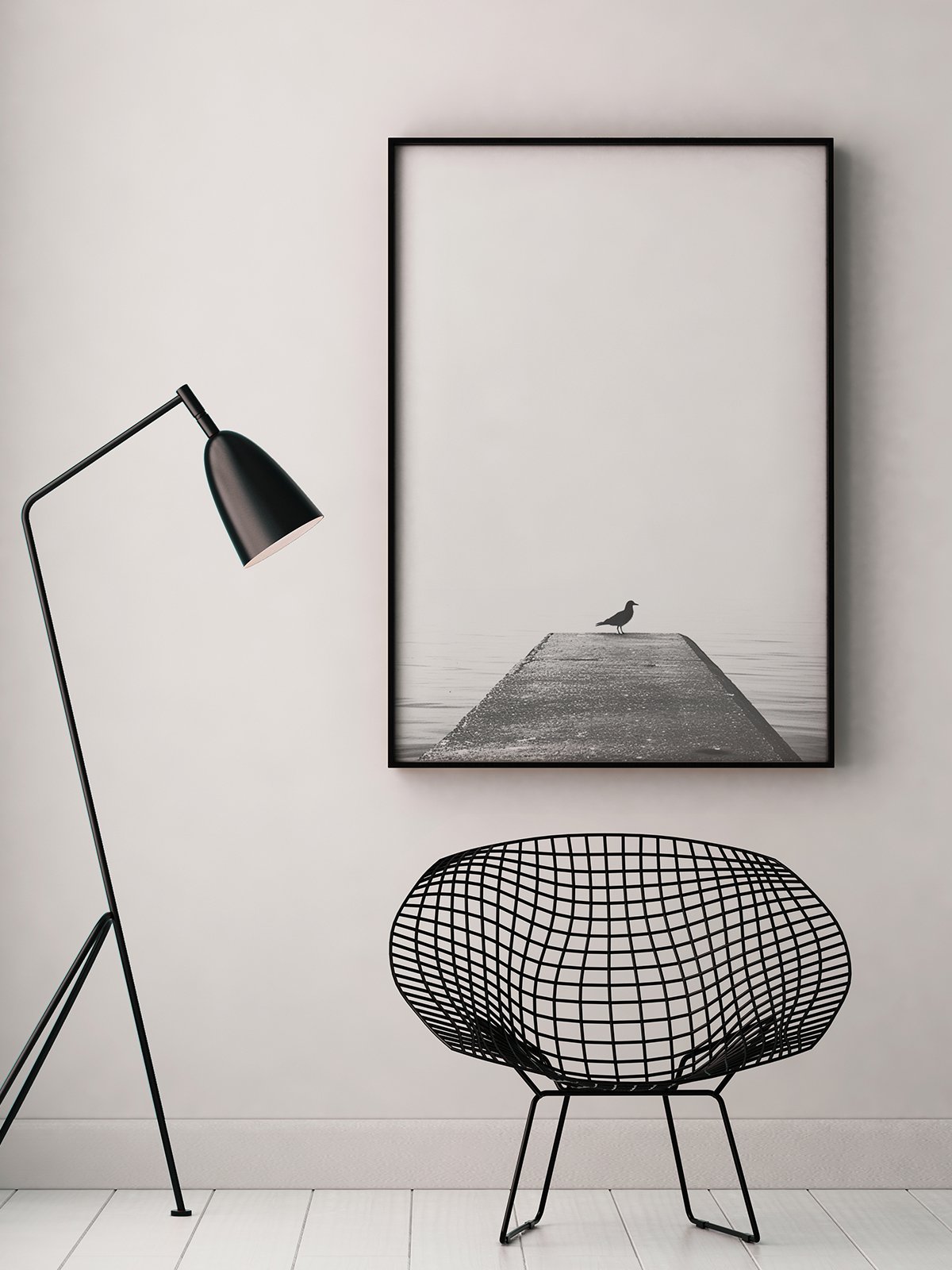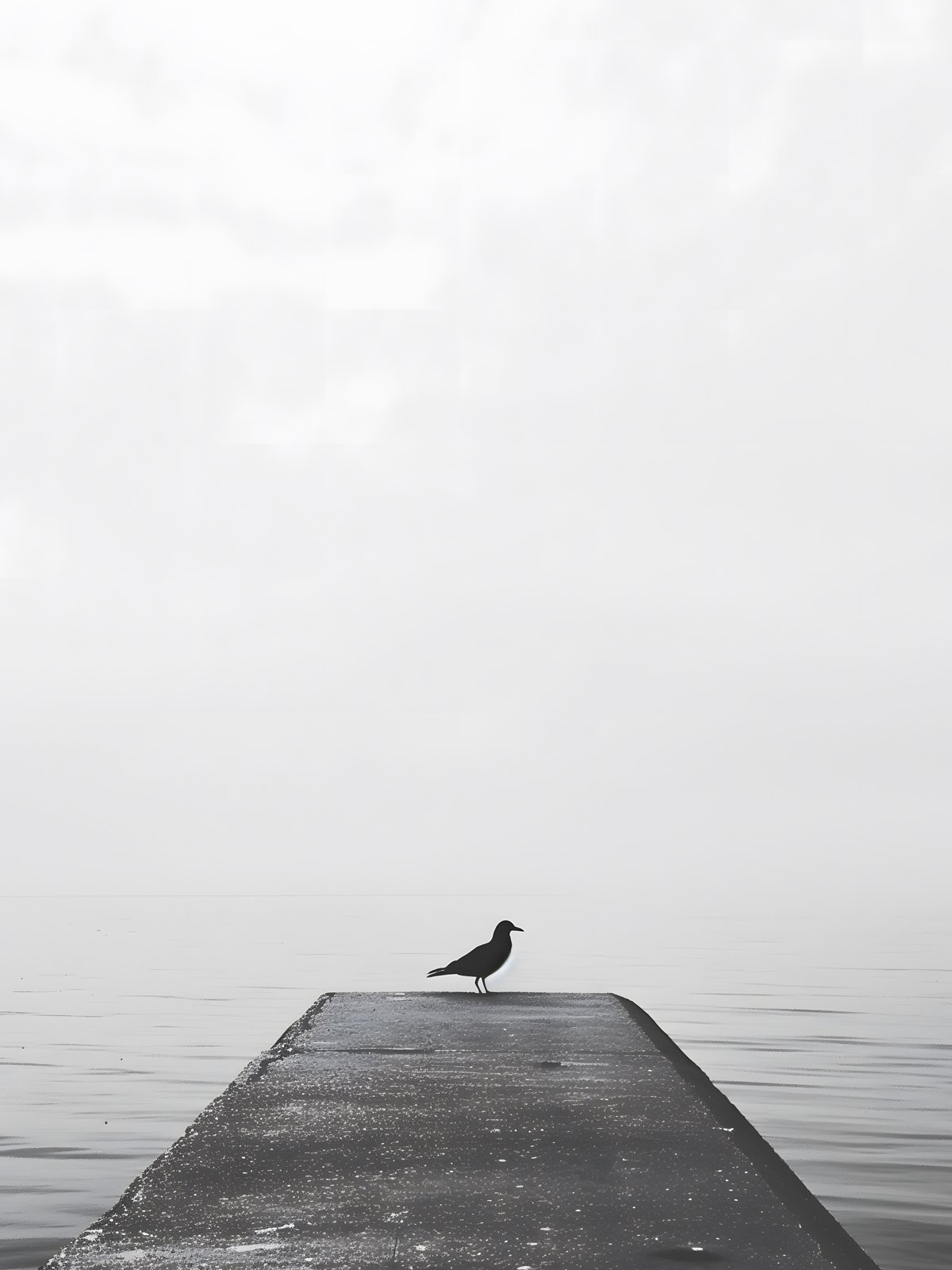 This black-and-white photograph features a seagull standing at the end of a pier that stretches into an infinite sea, surrounded by calm waters and a misty sky. The minimalist scene evokes a sense of solitude and tranquility, as if time has stopped, inviting contemplation and relaxation.