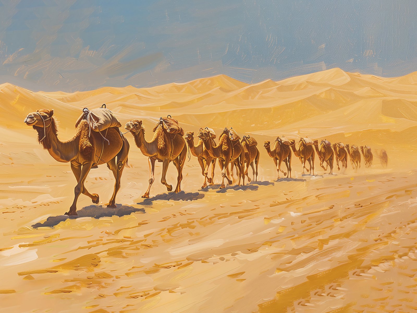 «Silhouettes of the Desert Camels» depicts a caravan of camels trekking through the vast desert. The scene captures endless golden sand dunes under a deep blue sky, with camels marching in a neat line, casting long shadows across the sand. The artwork, with its delicate brushstrokes and rich colors, showcases the grandeur and vastness of the desert, as well as the resilience and determination of the camel caravan in such a desolate environment. This painting conveys a sense of serene beauty, immersing the viewer in the unique tranquility and magnificence of the desert.