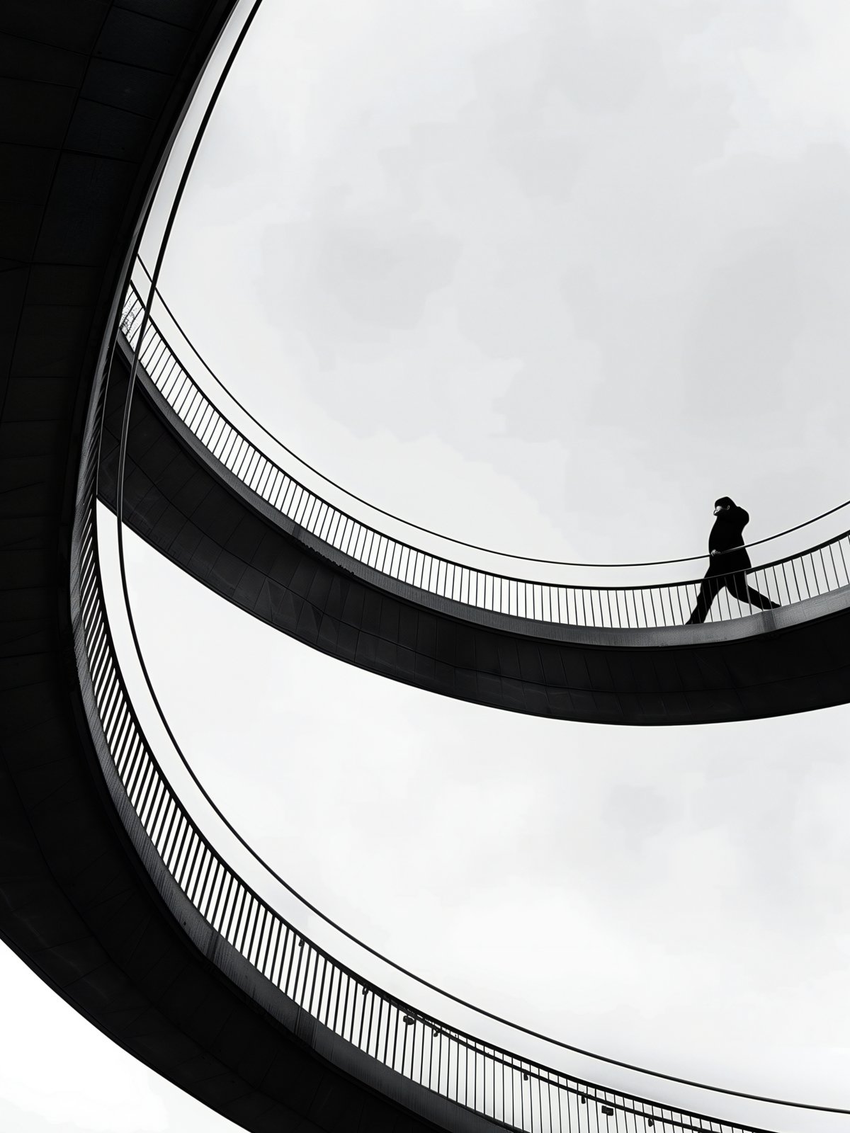 A lone pedestrian walks on an elevated walkway. The curved design of the path and the simple black-and-white palette showcase the unique beauty and solitary atmosphere of modern urban life. The distinctive perspective and minimalist composition emphasize the starkness and artistry of city living.
