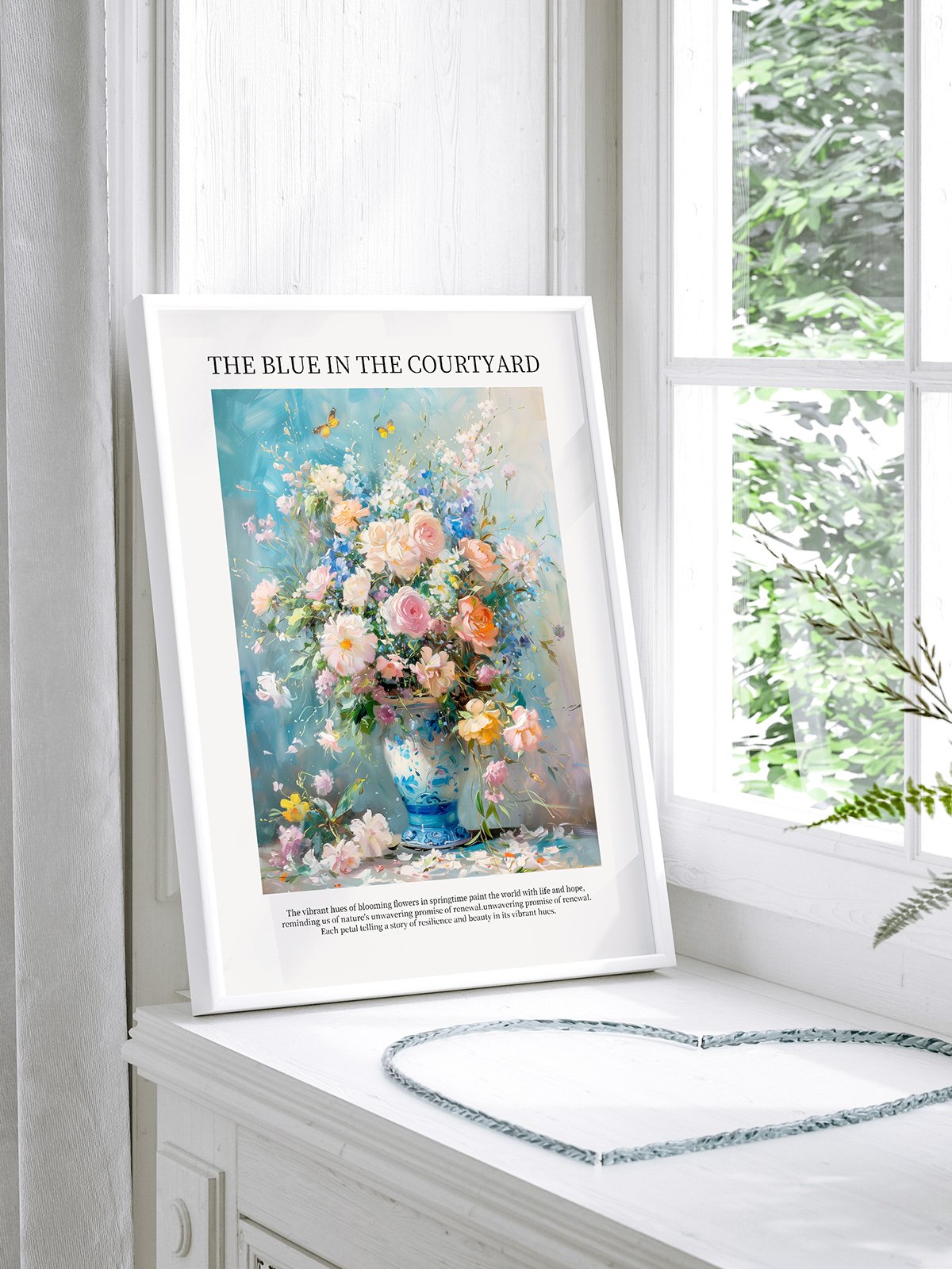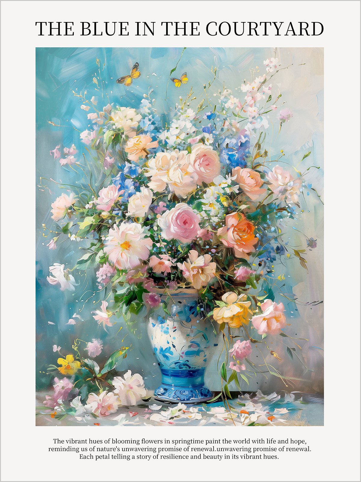 Vibrant flowers bloom in a blue vase, with bright colors and delicate petals. Butterflies flutter gracefully, bringing a vivid atmosphere. The cheerful hues highlight the vitality and energy, leaving one refreshed and joyful, as if standing in a spring garden.