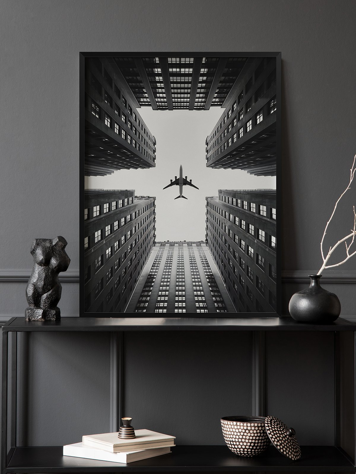 This black-and-white image of an airplane flying through city skyscrapers evokes a strong modern urban rhythm. The interplay between the plane and the buildings creates a dynamic and tense scene, showcasing the bustle and vitality of the city.