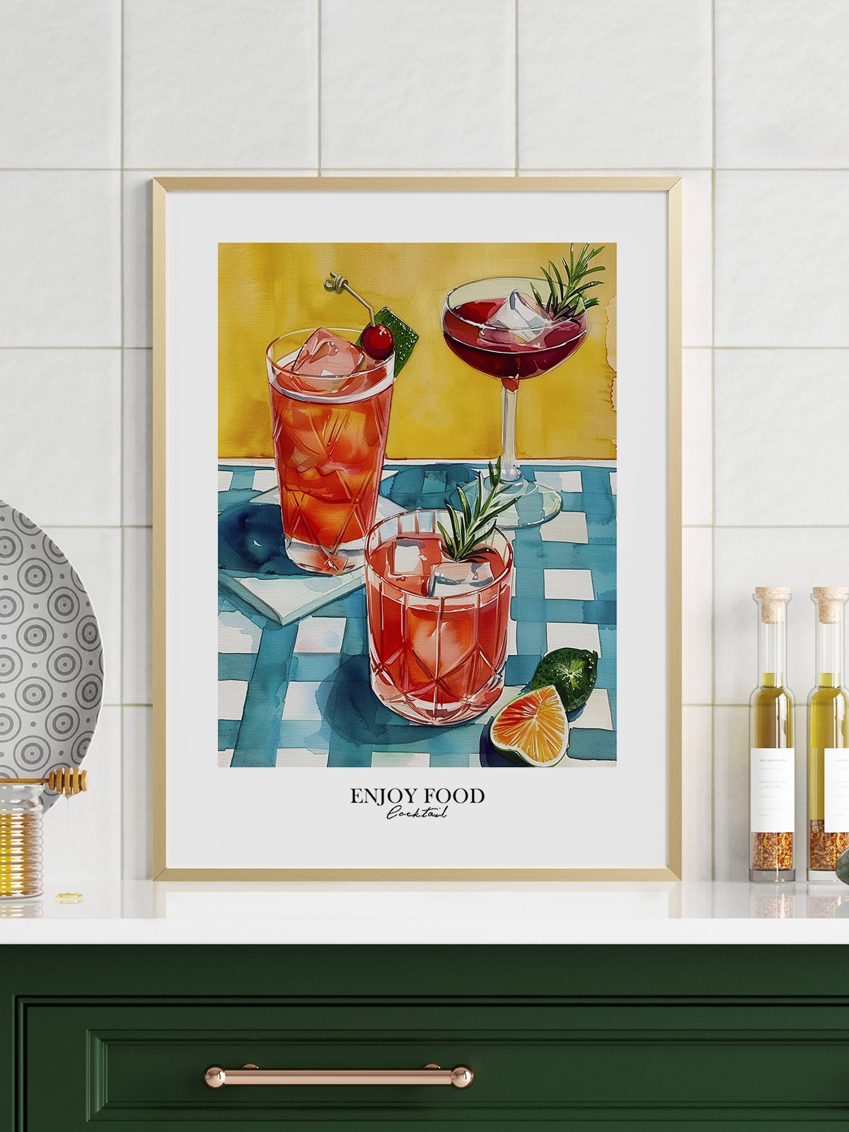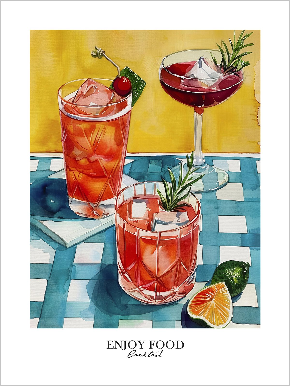 On a blue and white checkered tablecloth, colorful drinks stand out. A deep red cocktail adorned with a cherry and a pinkish beverage topped with an orange slice. A small green plant adds vitality to the scene. The vibrant colors and smooth brushstrokes create a cheerful atmosphere, evoking the freshness and sweetness of summer.