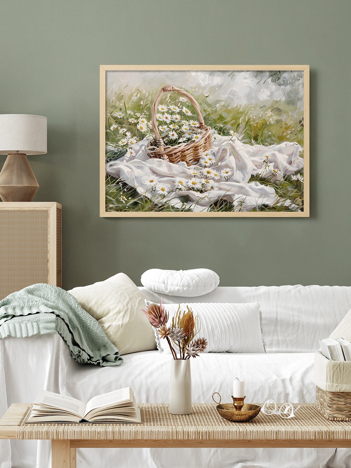 A basket filled with pure white daisies rests in a verdant meadow, their petals tinged with yellow, bursting with life. The earthy brown woven basket adds warmth, while a few daisies peek out, mingling with those scattered around. The blurred green backdrop fosters a serene, natural ambiance, inviting tranquility and delight.