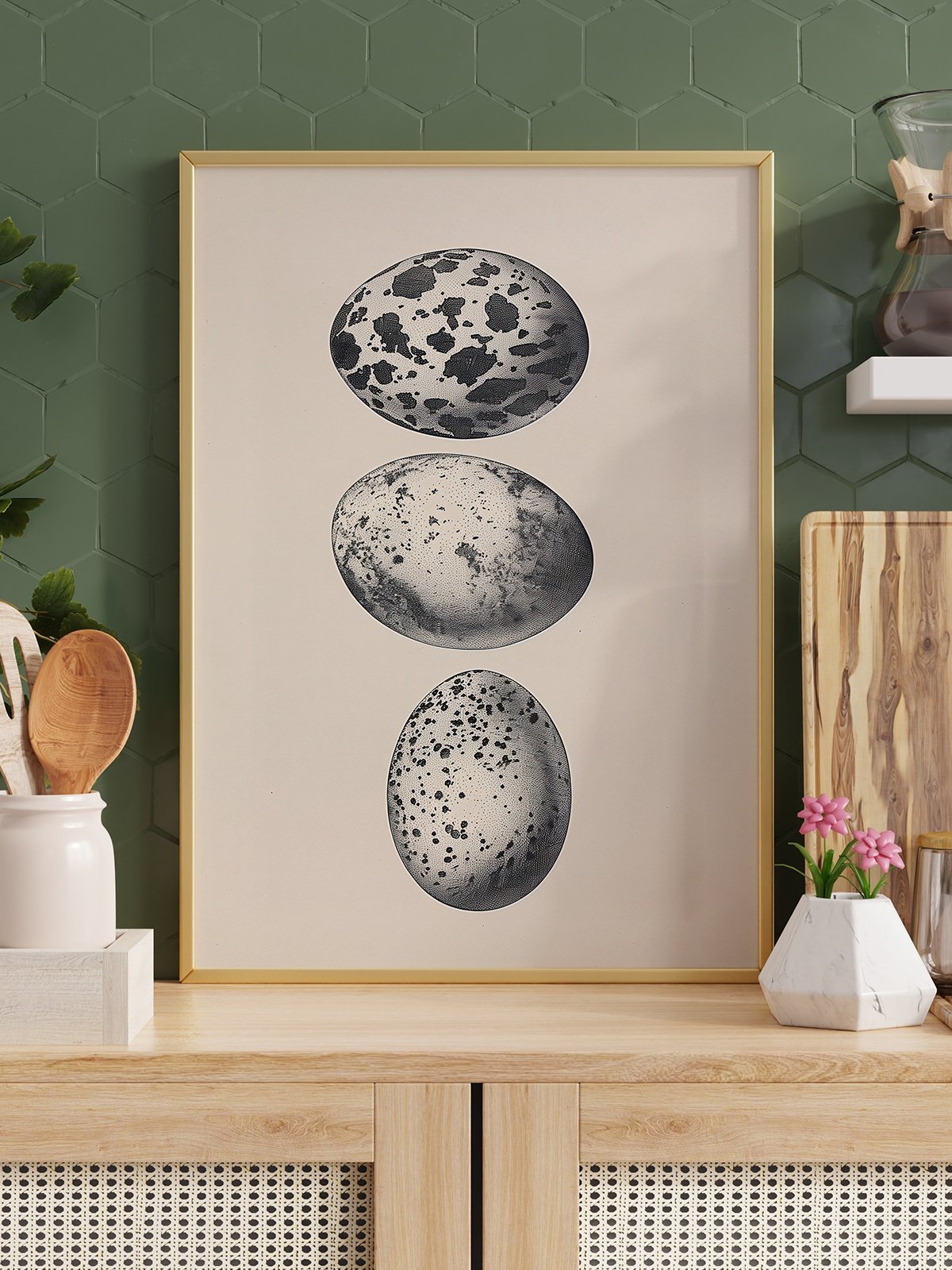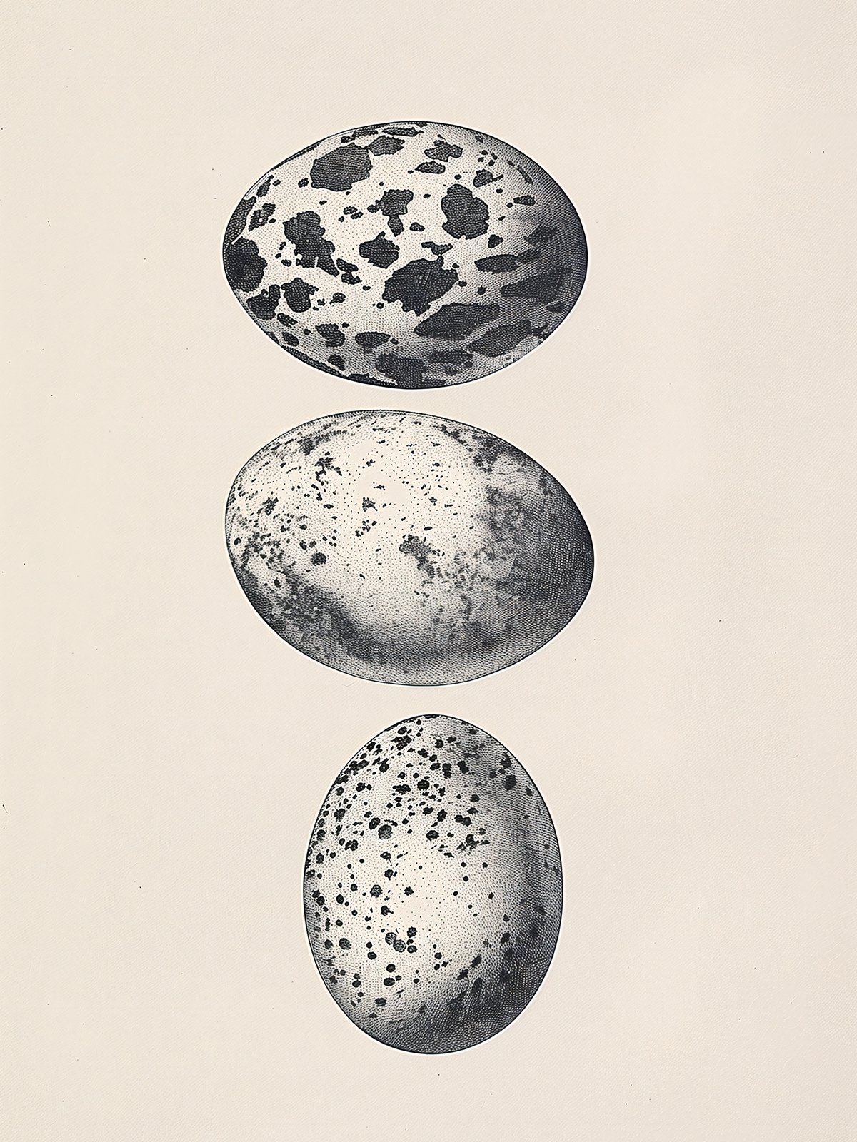 This artwork features three speckled bird eggs arranged in sequence on a minimalist background. Each egg displays a unique pattern of spots, with detailed brushstrokes highlighting the texture and subtle tonal variations of the eggshells. The contrast of black and white enhances the depth and artistic effect of the composition. The entire piece is simple yet profound, illustrating the rich diversity of nature and the wonder of life. The arrangement of the three eggs brings a sense of visual harmony and balance.