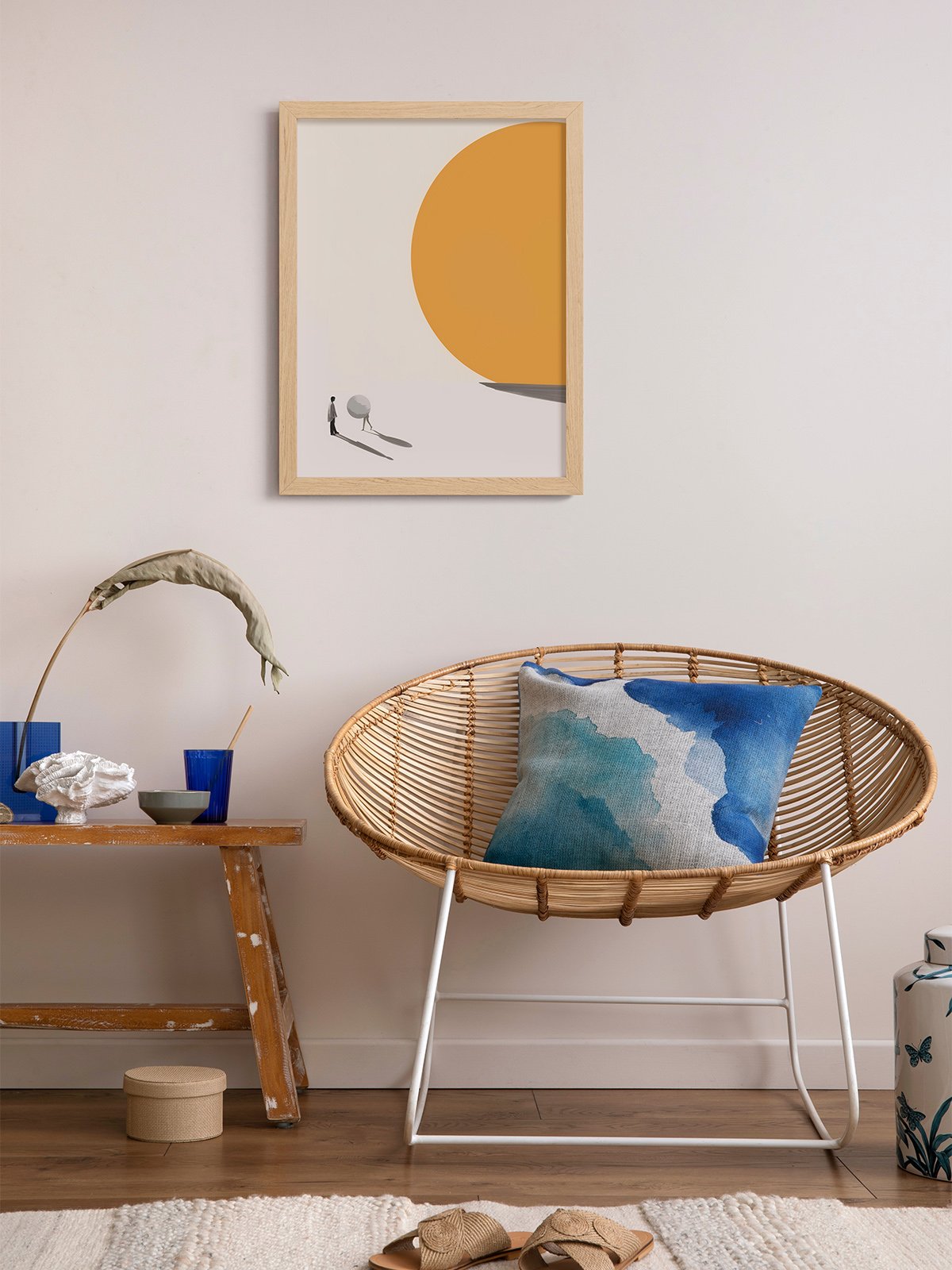 In this minimalist image, a walker stands face-to-face with an anthropomorphic sphere, against the backdrop of a gigantic orange circle symbolizing the sun. The orange sphere casts a silhouette of the walker and the sphere, creating a sense of vastness. The artwork, through its simple lines and bright colors, conveys the relationship between humans and nature, and the universe, evoking feelings of the individual’s smallness and solitude in the vast cosmos.