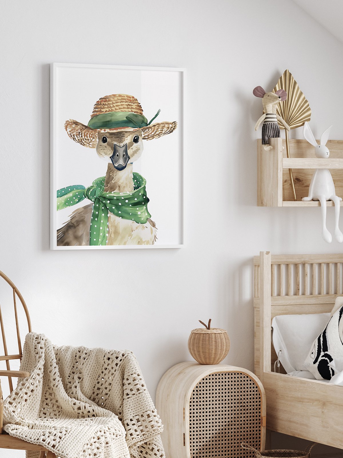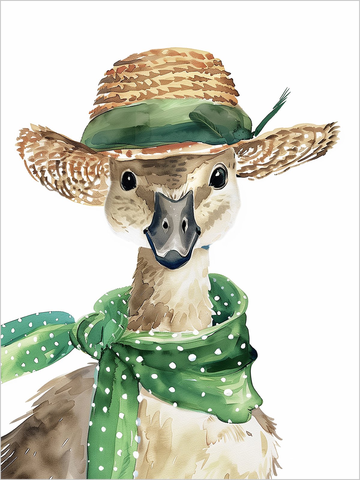 In this watercolor painting, a cute duck wears a green straw hat and a colorful scarf around its neck, with a look of intelligence and curiosity in its eyes, showing its playfulness and warmth.
