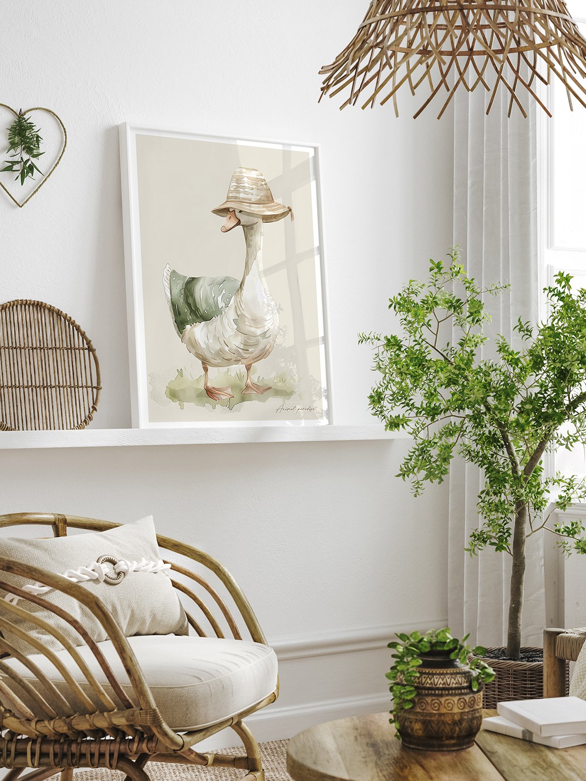 In this watercolor painting, a cute duck wears a green straw hat and a colorful scarf around its neck, with a look of intelligence and curiosity in its eyes, showing its playfulness and warmth.