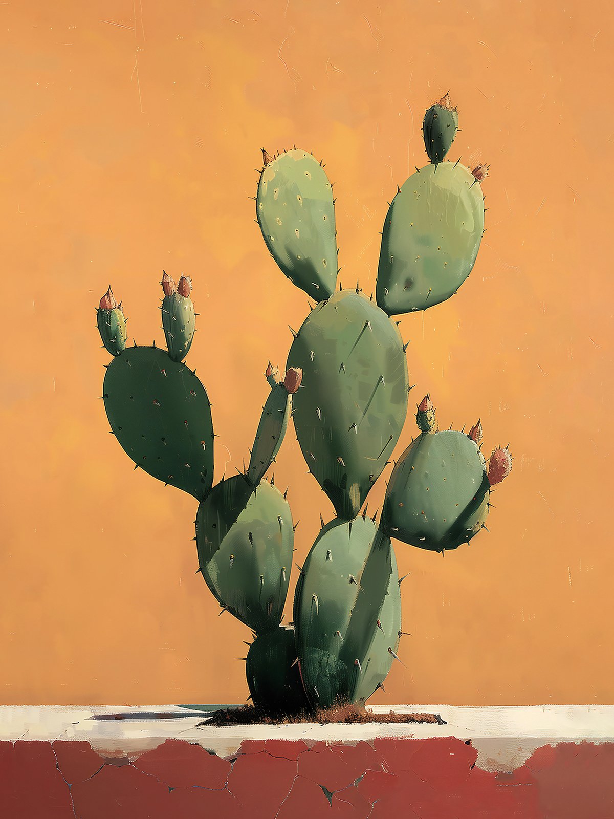 The cactus stands tall under the bright sunshine, with its verdant leaves and yellow flowers shining brilliantly, symbolizing the tenacity and vitality of life. The entire scene is filled with a sense of vigor, telling a story of perseverance and hope, inspiring us to forge ahead and embrace a bright future.