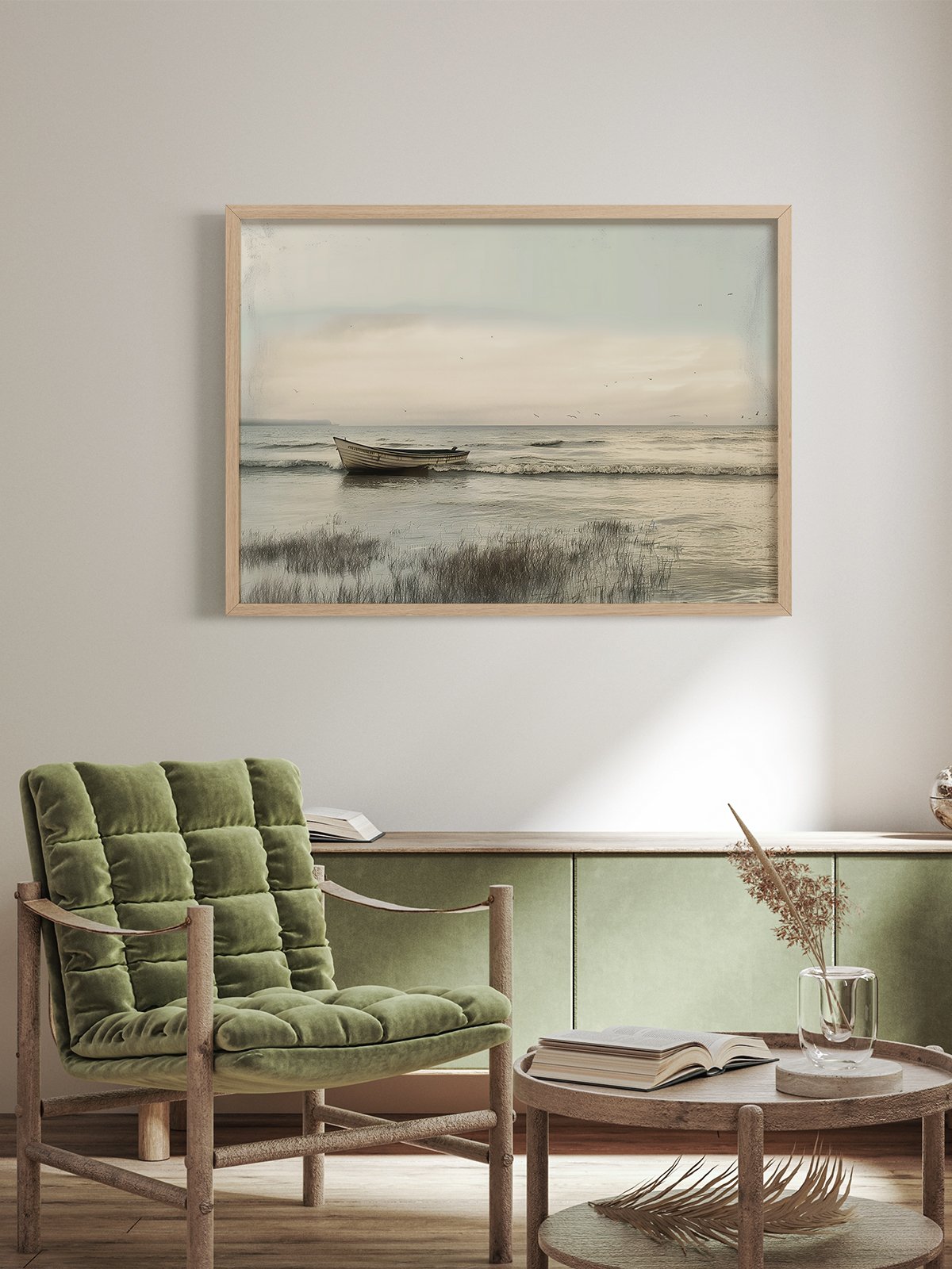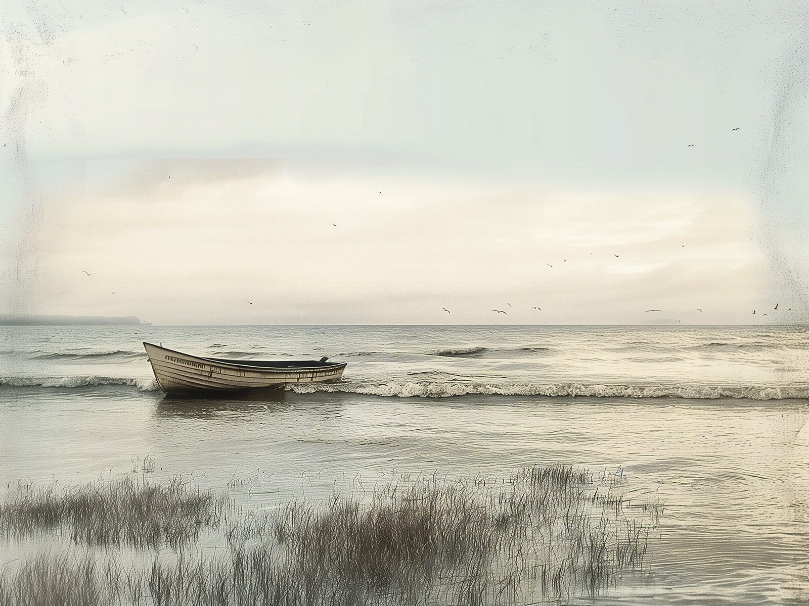 This painting showcases a solitary boat quietly anchored at the beach, with gentle waves and distant flying seagulls creating a serene and peaceful atmosphere. The soft tones and simple composition convey a sense of natural beauty and inner calm, evoking the power of tranquility and the vastness of nature.