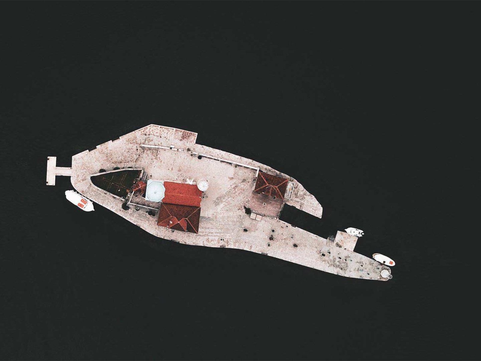 This image showcases a solitary island, viewed from above, making it appear as if it’s floating on the deep waters. The structures on the island exude tranquility and solitude, while the surrounding dark waters add a sense of mystery and calm, as if time has stopped here.