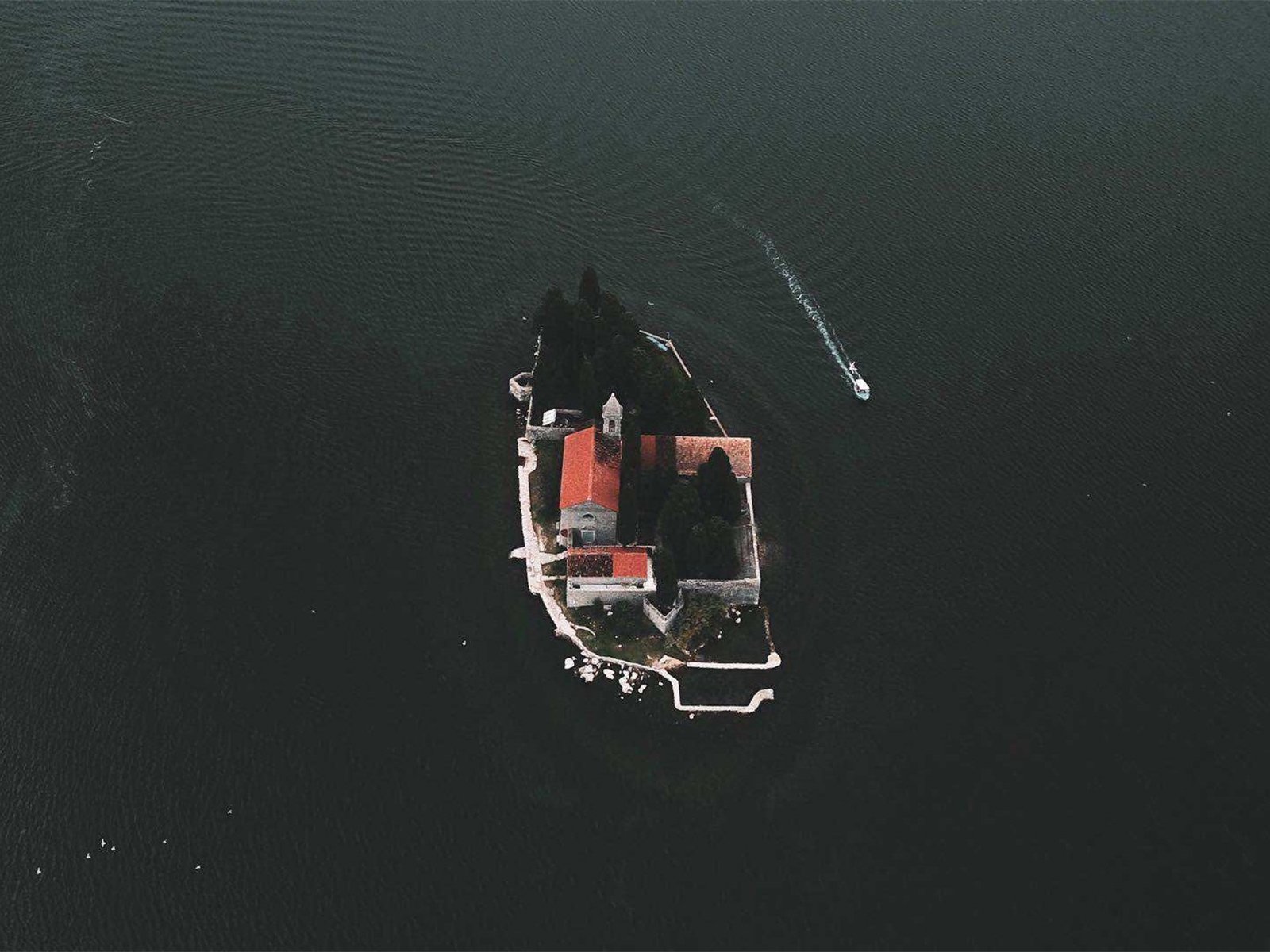 This image showcases a small island surrounded by deep, calm waters, embodying solitude and serenity. The aerial view captures the island like a lonely heart, quietly floating on the lake, evoking feelings of peace and isolation, as if detached from the world’s chaos.