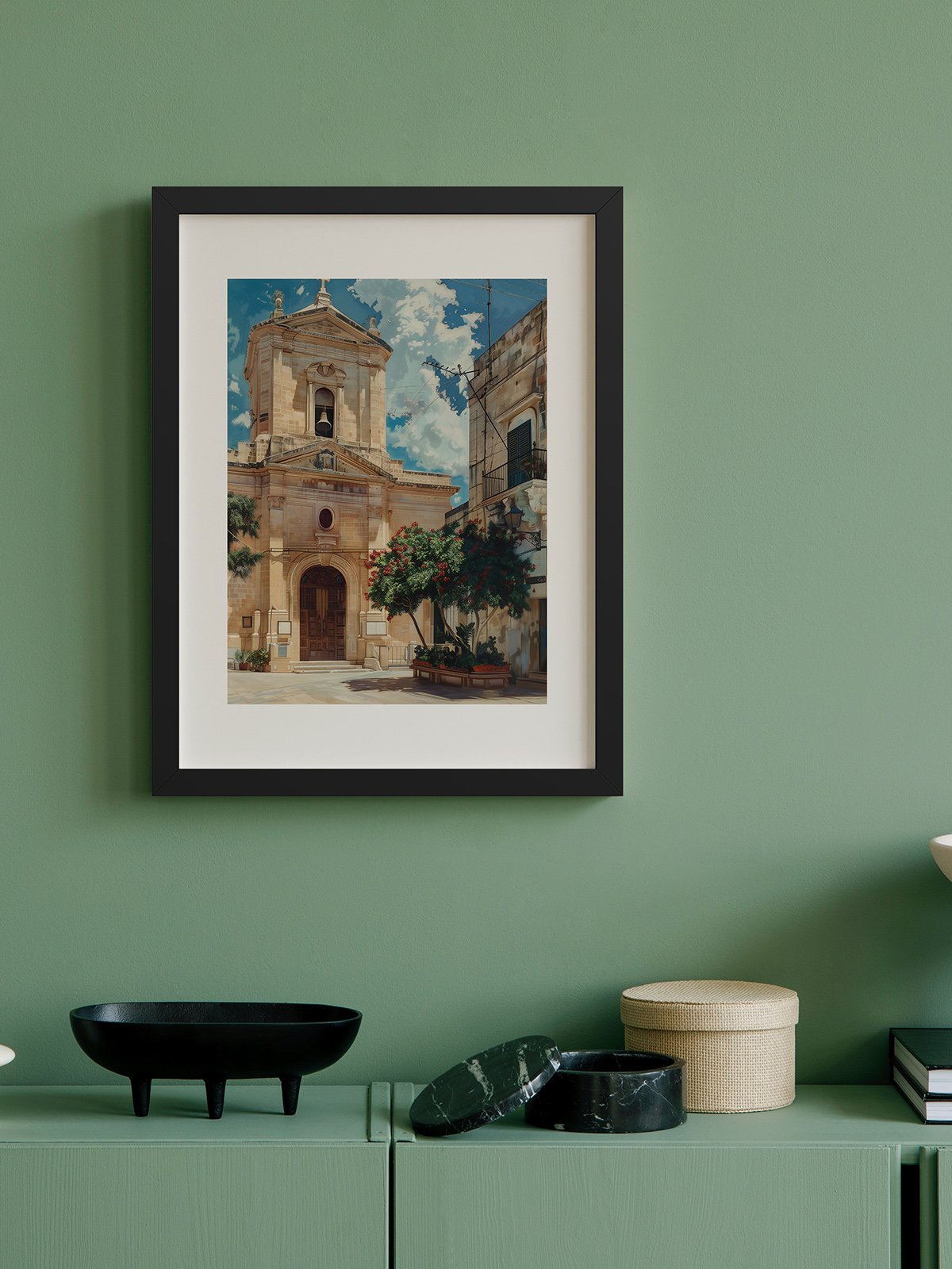 An old church stands solemnly and peacefully against a backdrop of blue sky and white clouds. Sunlight bathes the stone walls of the building, casting a warm glow. The greenery and red flowers around the church add vitality and color to the scene. The interplay of shadows and light on the street creates a harmonious and tranquil atmosphere.
