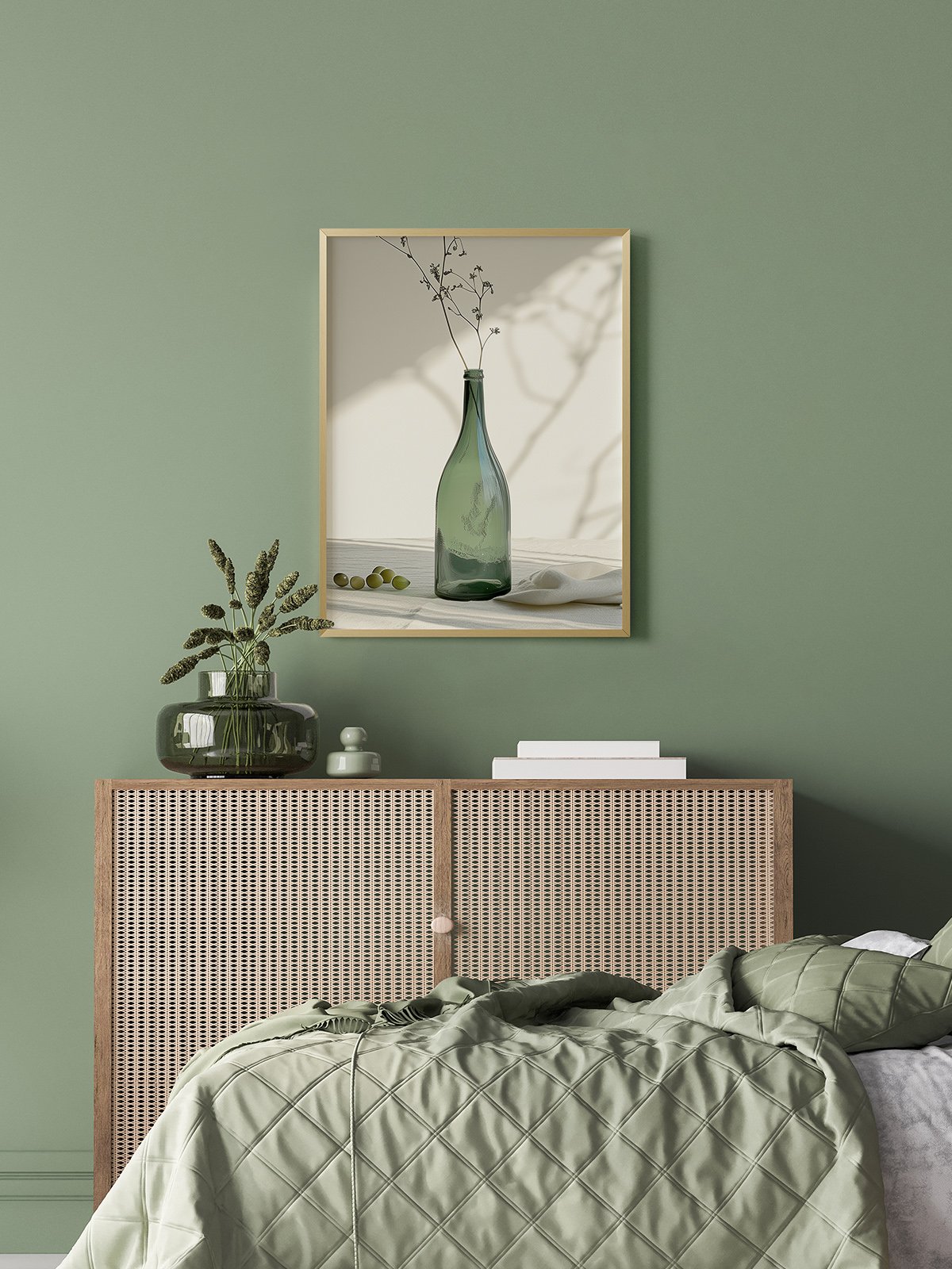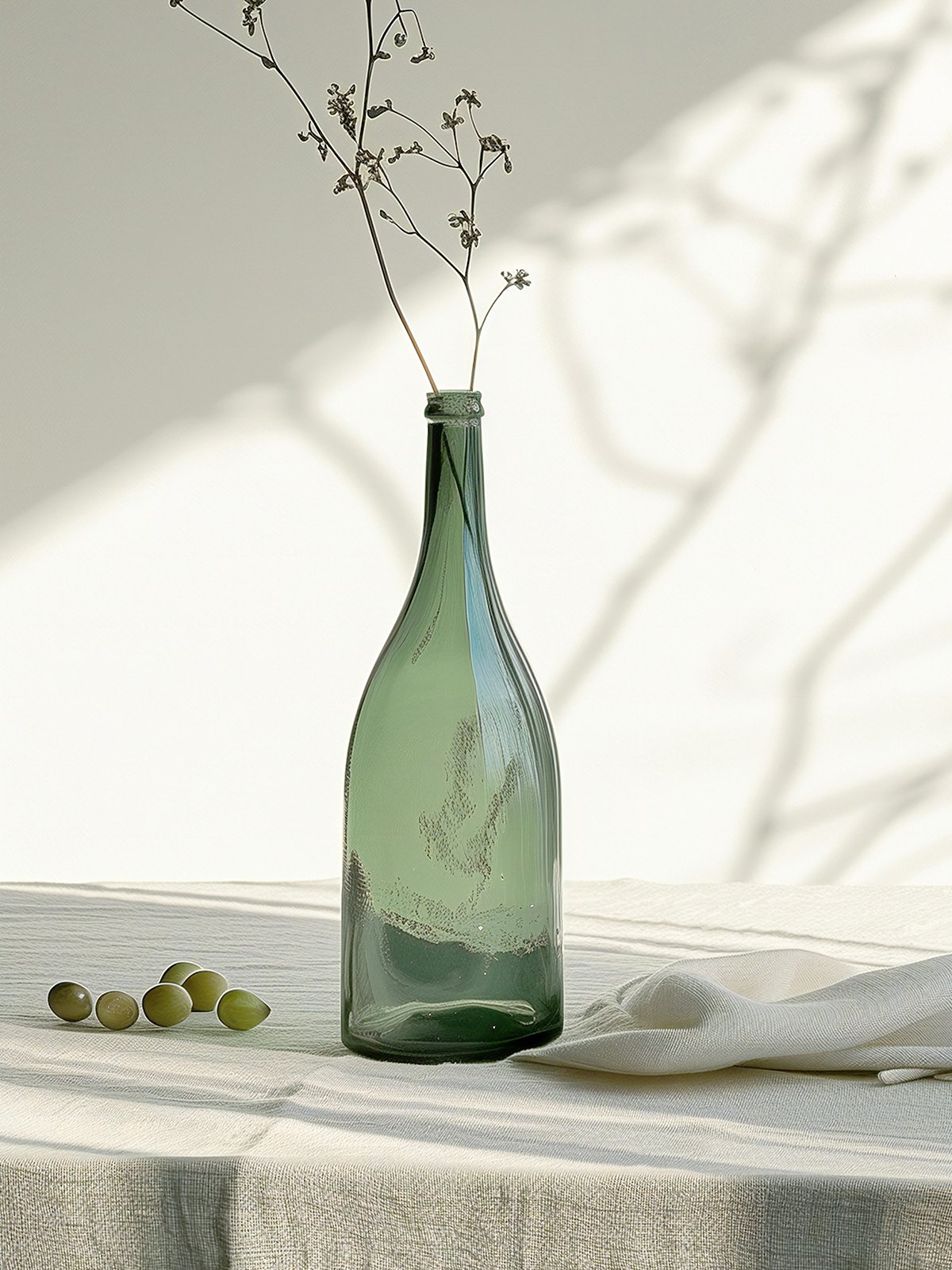 This photograph captures the beauty of minimalism. A green glass bottle stands quietly on a table covered with a cloth, with a few dried flowers placed inside, evoking a sense of tranquility and peace. Scattered on the table are a few green olives, adding a touch of nature to the scene. The interplay of light and shadow in the background creates a soft ambiance, as if sunlight is streaming through a window, bringing warmth to the interior. Through simple elements and soft tones, this piece conveys an aesthetic of serene beauty.