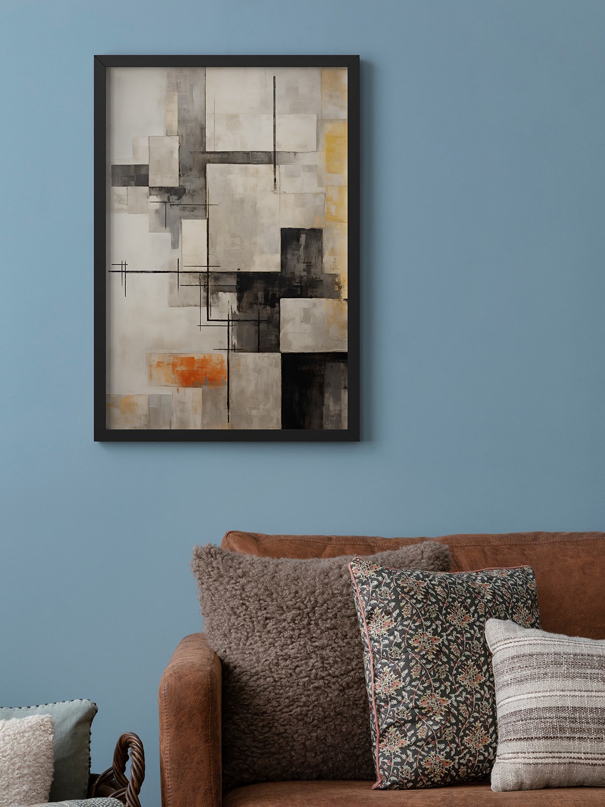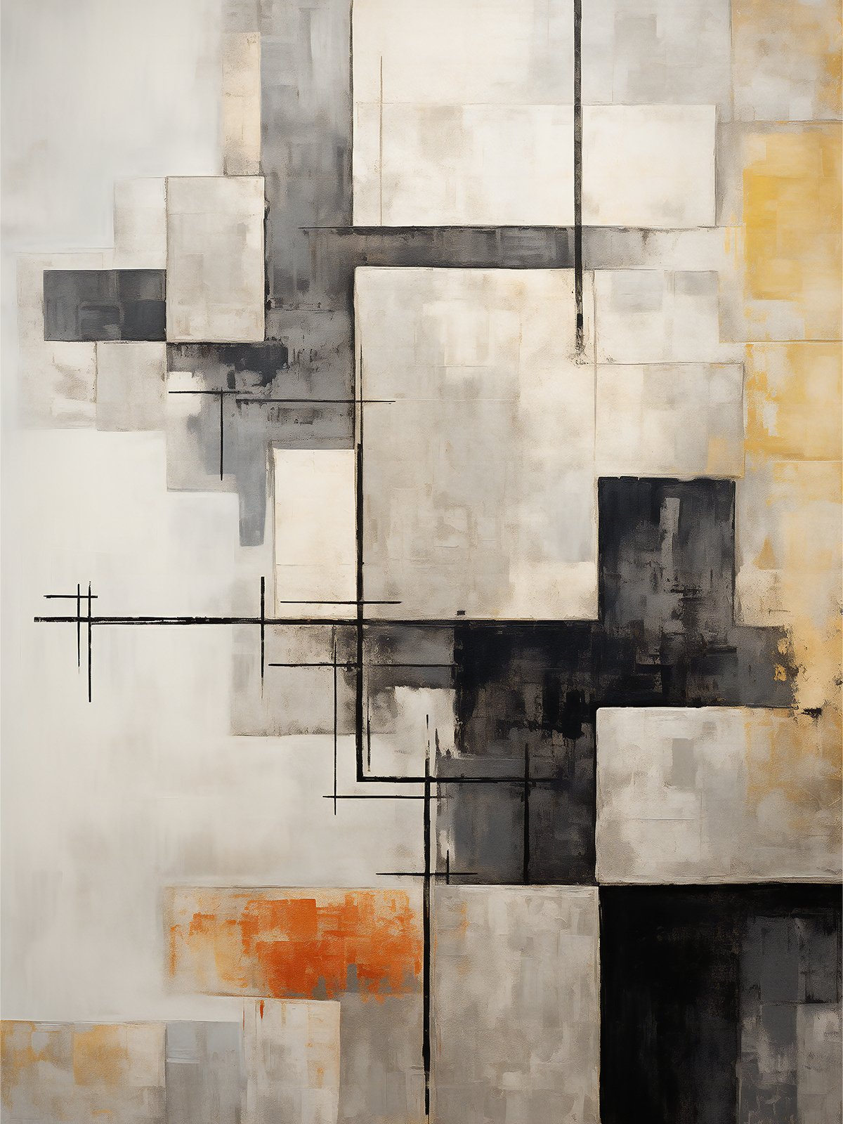 Inspired by architectural elements, this abstract painting intertwines black, orange, and yellow color blocks, creating a layered and dynamic urban scene. The contrast between blurred boundaries and clear lines reflects the coexistence of hustle and bustle and order in the city. The warm colors inject a modern atmosphere into the work, highlighting the vitality and changes of the metropolis, and adding an artistic touch and urban style to the space.