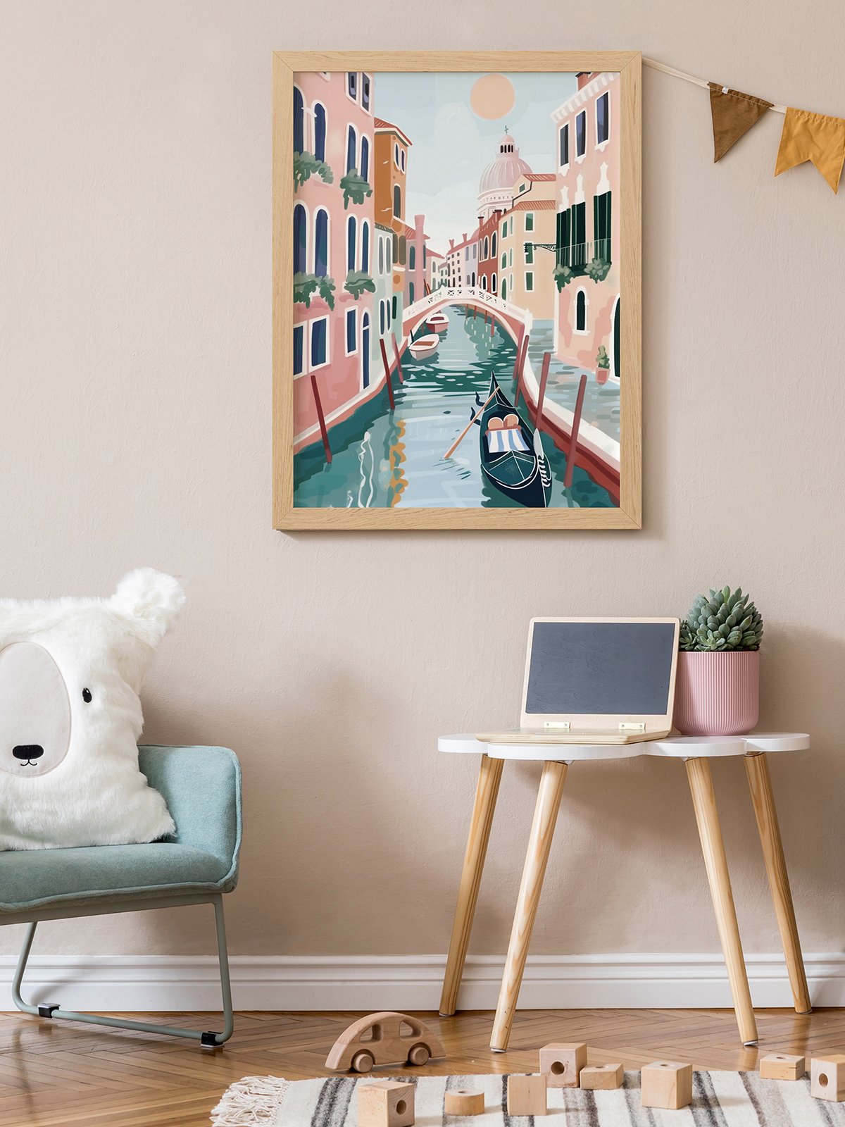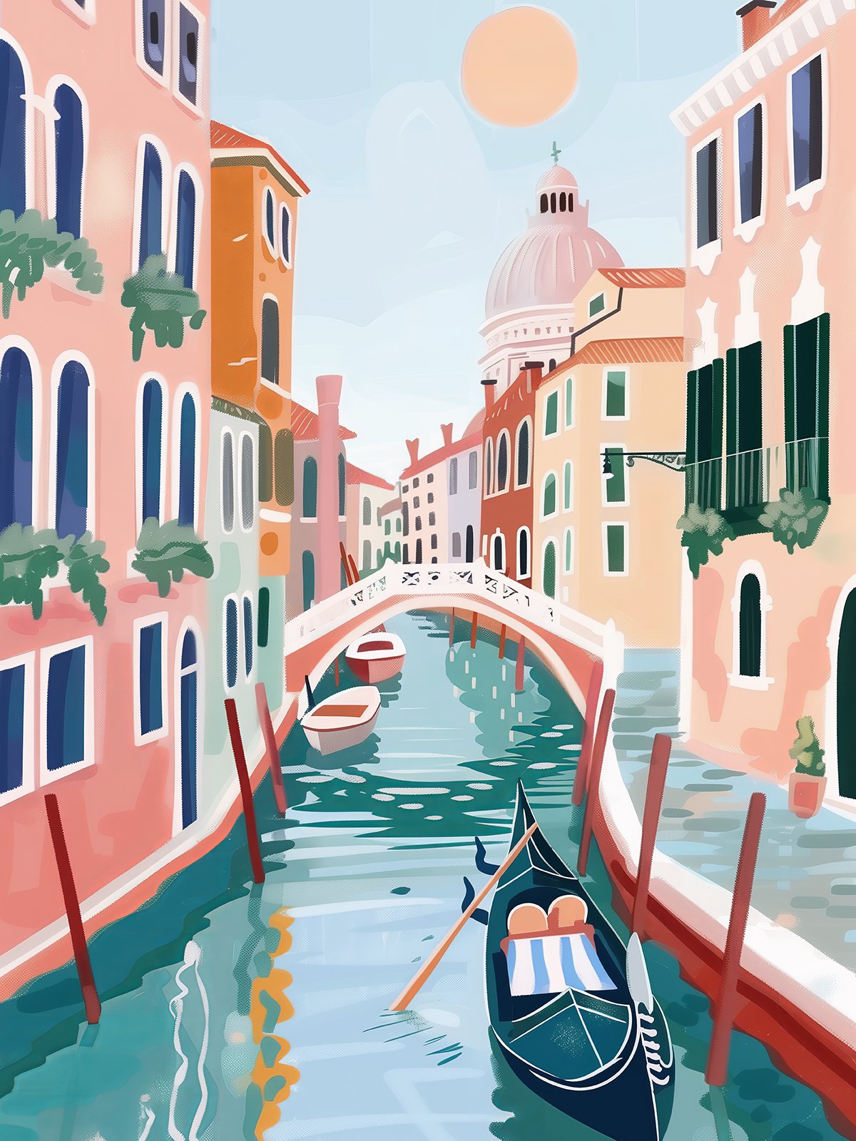 This painting depicts the beautiful scene of a Venice canal under the bright sunlight. The vibrant buildings and calm water give a warm and peaceful feeling. The small boats and arch bridge add a touch of romance, as if transporting us to a dreamlike city.