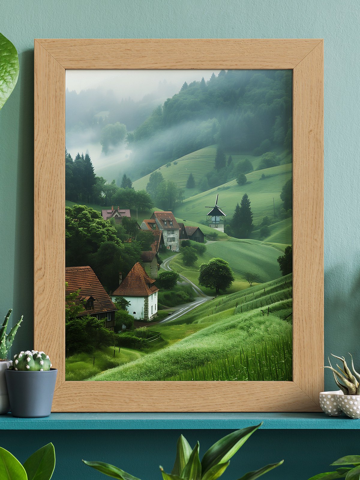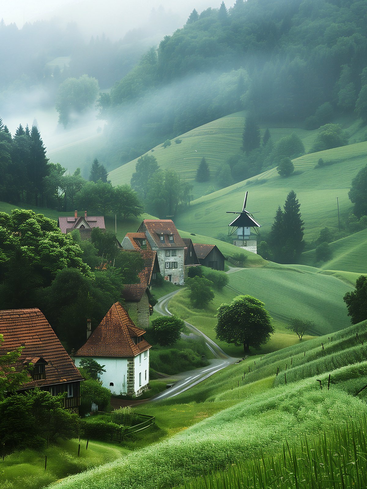 This painting depicts a small village surrounded by green fields and forests, with morning mist lingering in the valley, adding a sense of mystery and tranquility. The red-roofed houses and windmill dot the green landscape, conveying a serene pastoral life.