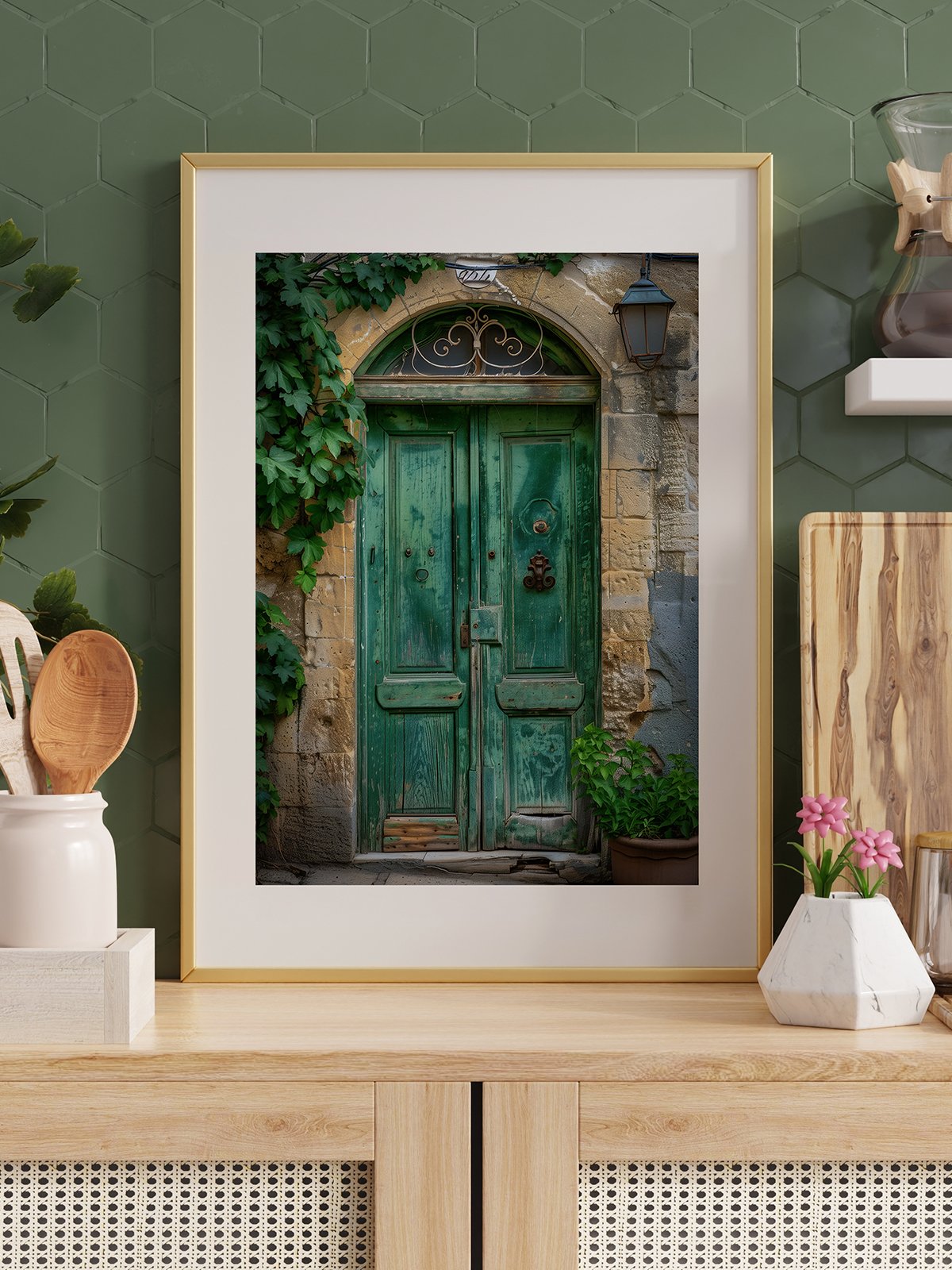 An old green wooden door, surrounded by climbing green vines, exudes an ancient and mysterious aura. The wrought iron decorations and weathered door panels tell tales of time, while the surrounding stone walls and old lantern add a sense of enduring history.