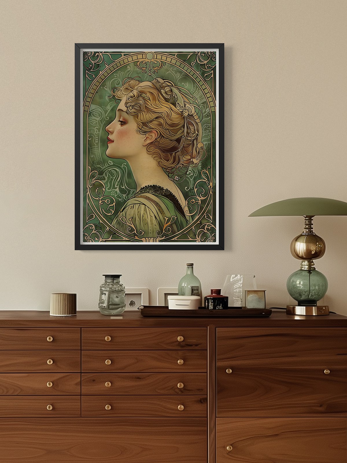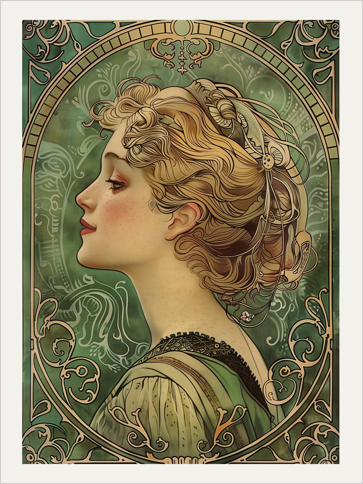 This painting depicts an elegant woman in classical attire against a backdrop of Art Nouveau-inspired green patterns. Her profile exudes tranquility and confidence, reminiscent of the unique beauty of the Art Nouveau era.