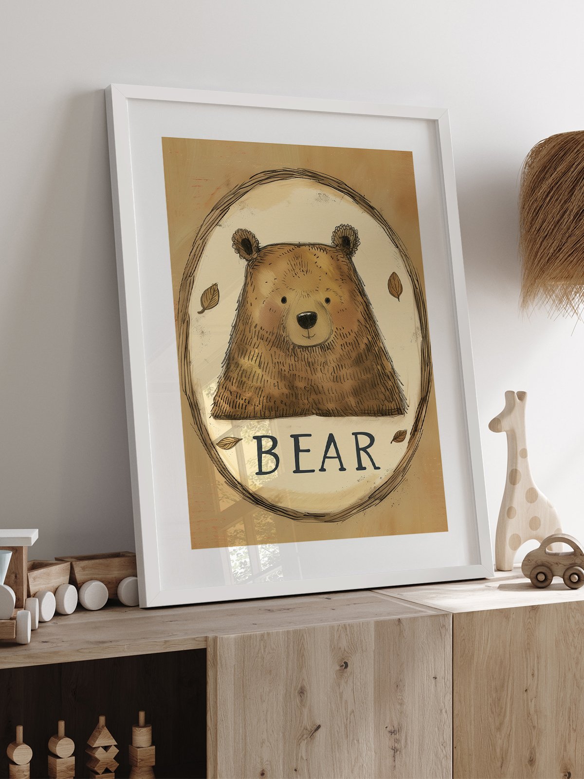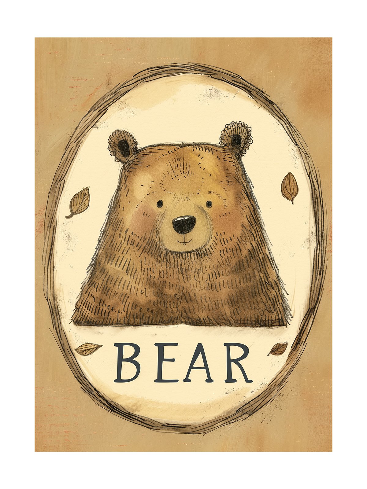 This is a heartwarming and cute illustration featuring a gentle-looking brown bear. The soft brown hues of the background complement the bear’s fur, creating a cozy atmosphere. The bear’s friendly smile is enhanced by a few autumn leaves scattered around, adding a seasonal touch. The artwork’s simplicity and delicacy make it perfect for children’s books or decorative purposes.