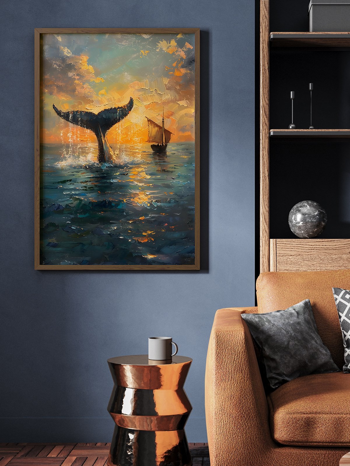 This painting depicts a magnificent scene of a whale leaping out of the sea at sunset. The distant sailboat adds to the charm of the sunset, creating a dreamy and mysterious atmosphere. The vivid colors and interplay of light and shadow make one feel the grandeur and wonder of nature.