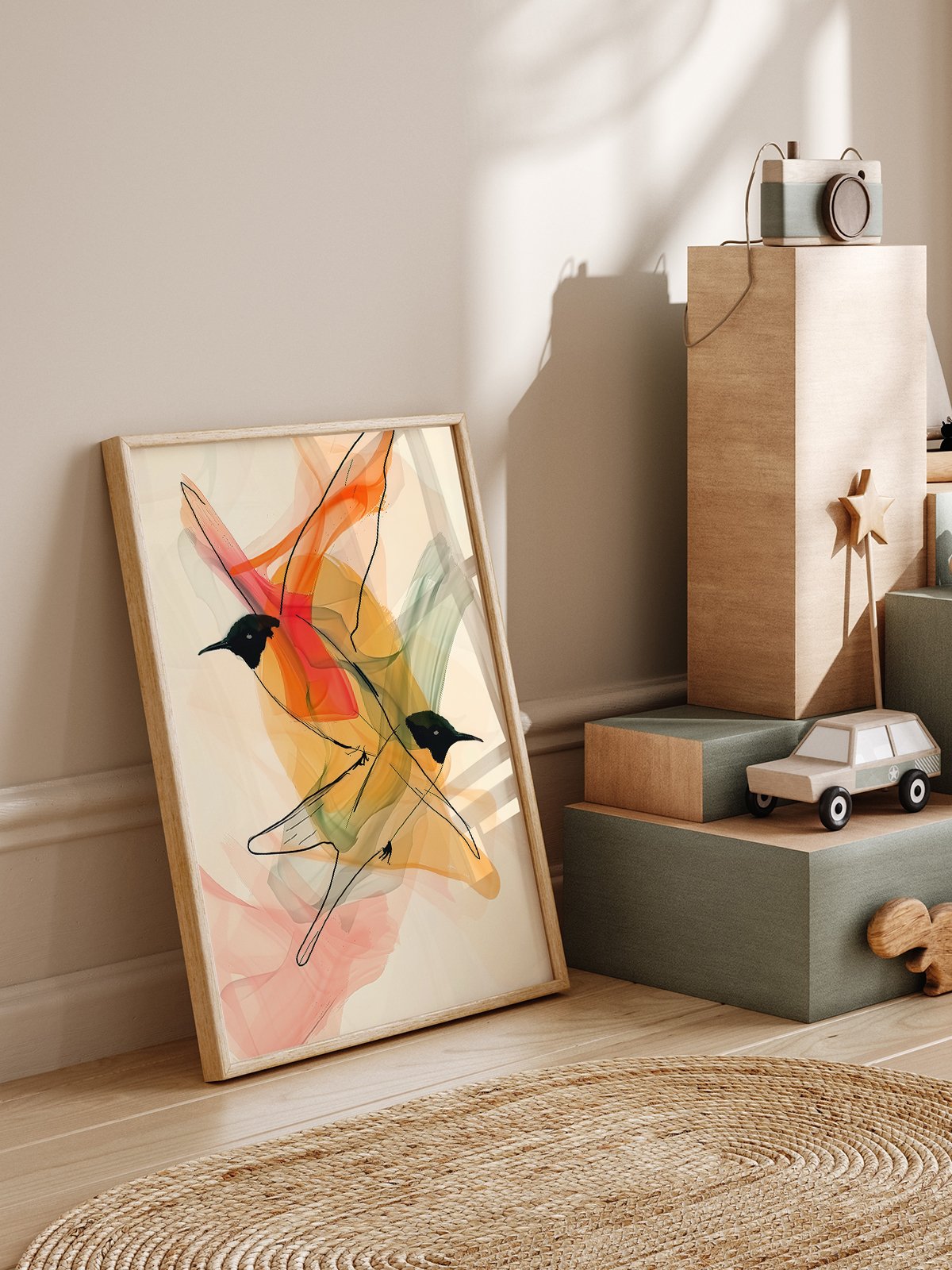 | This painting, titled «Wings of Freedom,» abstractly captures two hummingbirds in flight. The light, flowing lines outline the birds’ movements, as if they are soaring freely in the air. The colorful, flowing lines in the background resemble dancing ribbons, full of motion and vitality, predominantly in shades of orange, green, and red, adding visual depth and interest. The black hummingbirds contrast sharply with the vibrant background, making them stand out prominently. Through the combination of color and line, this artwork showcases the dynamism and beauty of nature, conveying the spirit of freedom and the vibrancy of life. |