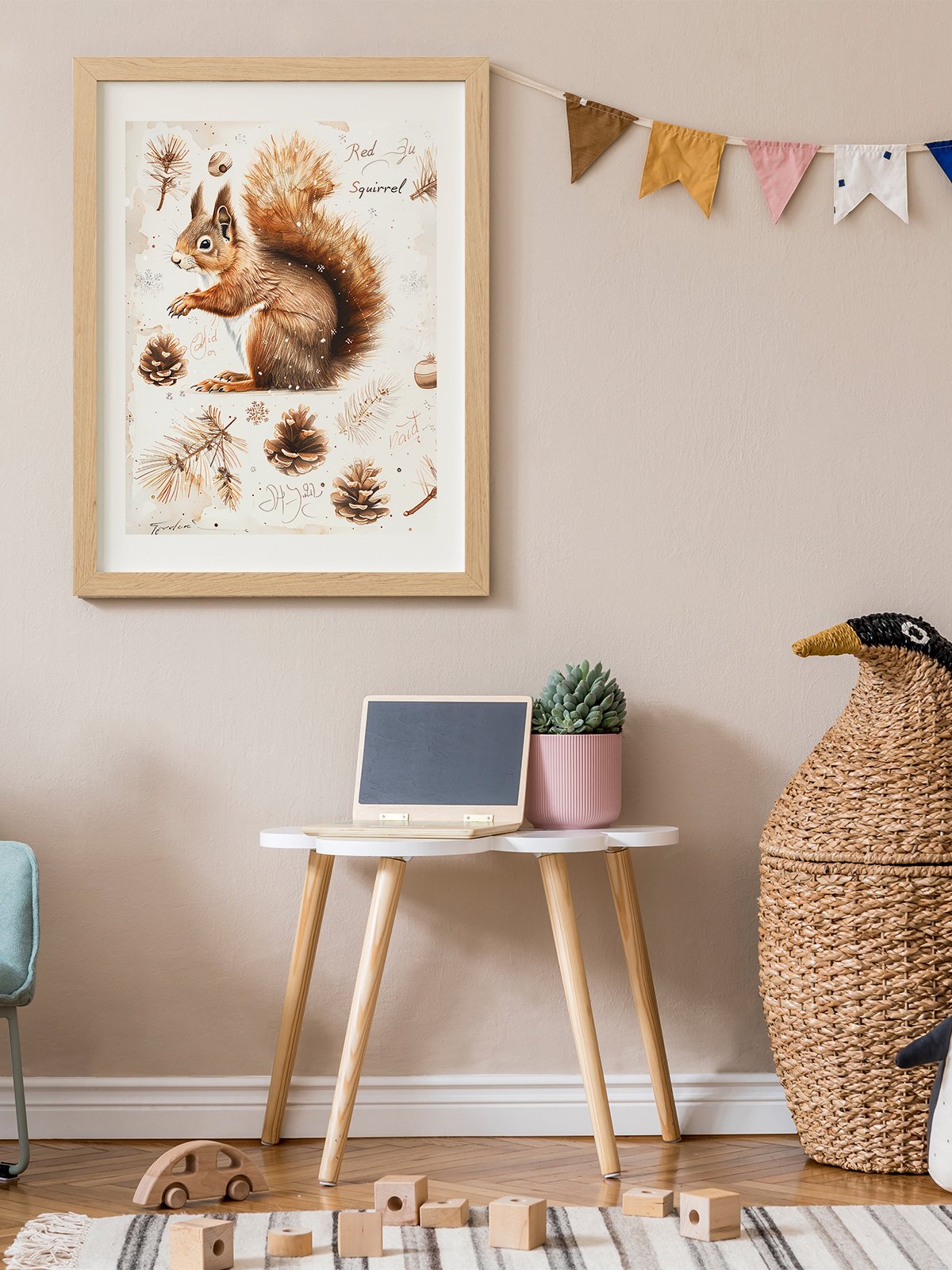 This painting depicts a cute squirrel surrounded by pinecones and pine needles. The squirrel’s fluffy tail and warm brown tones create a cozy and serene atmosphere. The entire image evokes a sense of nature and harmony, as if one is immersed in a tranquil forest.