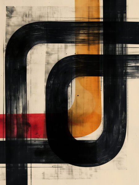 This abstract painting features simple lines and bold color blocks, displaying an interwoven path. The heavy black lines intersect with orange and red blocks, creating a complex and powerful visual effect. The gray and white tones of the background add depth and dimension to the piece, making the colors and