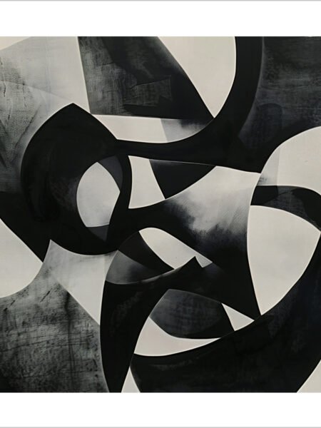 This abstract painting is a mesmerizing interplay of black and white, featuring dynamic, interwoven shapes that create a sense of movement and depth. The composition is dominated by sweeping curves and intersecting lines, forming an intricate dance of light and shadow. The use of varying shades of black and gray
