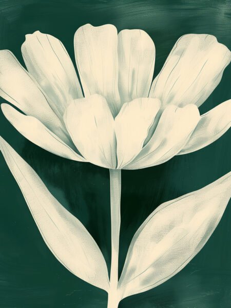 "Silent Bloom" portrays an elegant white flower against a deep green background. Delicate strokes highlight the texture of the petals and leaves, as if quietly blooming in the tranquil night. The simple color palette and soft lines create a serene and harmonious atmosphere, evoking the purity and beauty of nature.