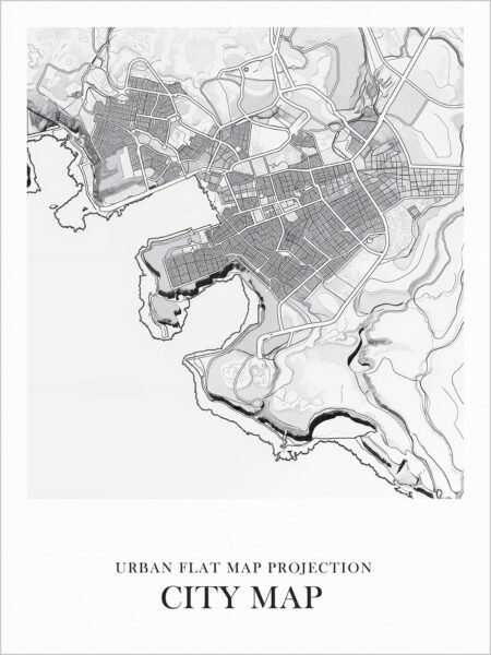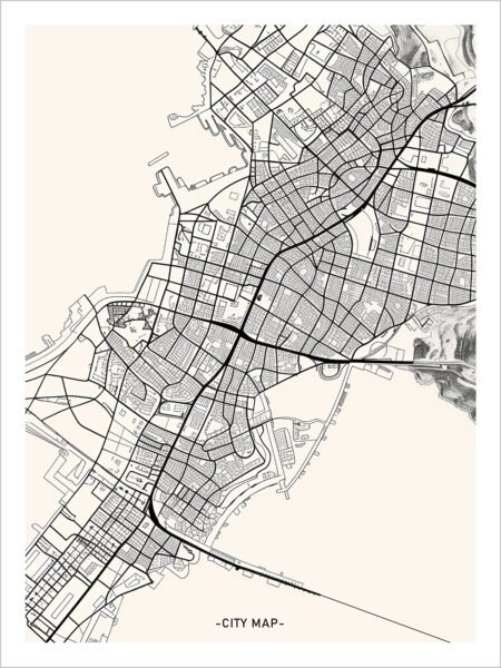 This image shows a detailed city map, clearly depicting the layout of streets and districts. The black lines outline the city's road network, presenting a simple yet refined aesthetic, as if revealing the city's pulse and vitality.