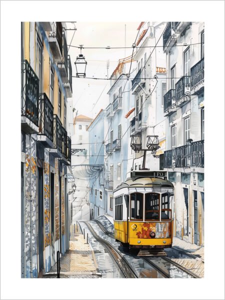 This painting depicts a yellow tram traveling through a narrow city street, flanked by tall buildings and balconies, with lights hanging overhead. The scene conveys a vintage urban atmosphere and a sense of tranquility.