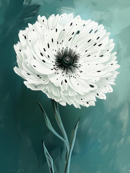 "Dewdrop Blossom" depicts a pristine white flower against a tranquil green background. Delicate strokes highlight the speckles and intricate texture of the petals, reminiscent of morning dew glistening on the flower. The simple color palette and detailed rendering create a fresh and serene atmosphere, capturing the purity and beauty of