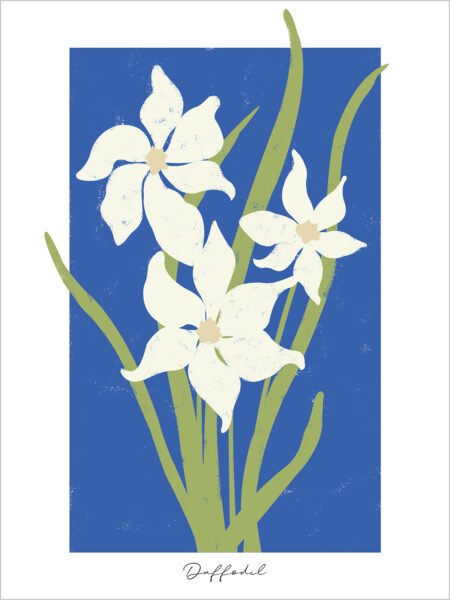 This simple illustration depicts a few white daffodils against a deep blue sky. The pure white flowers and green stems create a harmonious contrast, evoking a fresh and natural atmosphere. The entire image is simple yet full of vitality, as if conveying the breath of spring, bringing a sense of