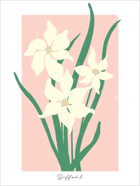 This simple illustration depicts a few white daffodils against a soft pink background. The pure white flowers and green stems stand out warmly against the pink backdrop. The entire image is simple yet full of vitality, as if conveying the tenderness and tranquility of spring, bringing a sense of peace